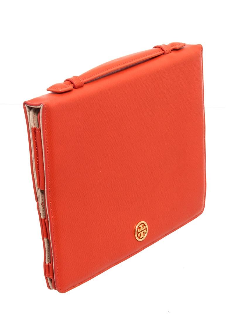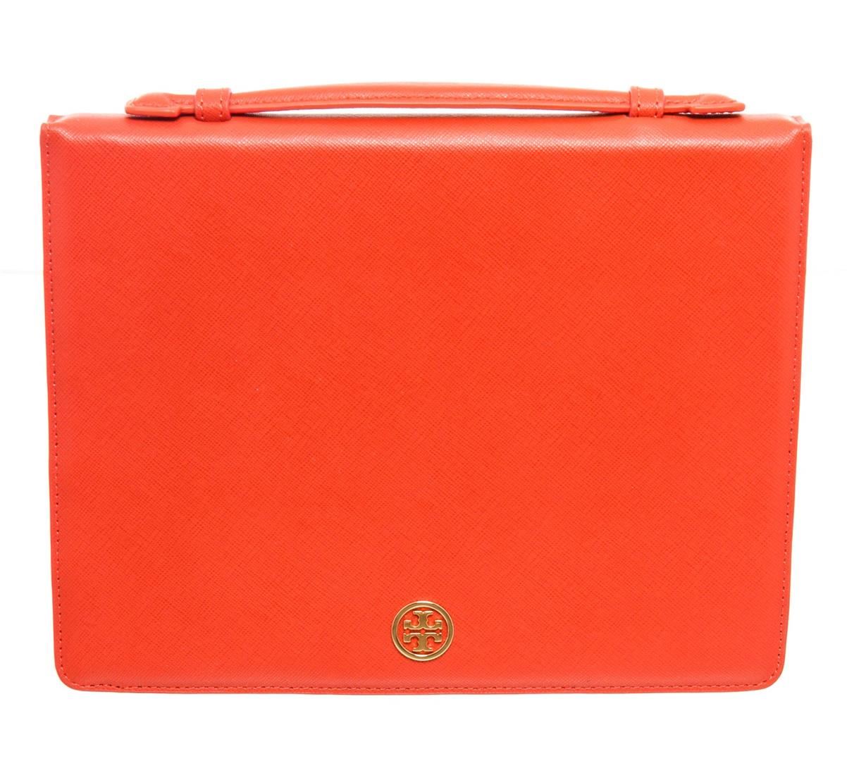 Tory Burch orange leather Robinson Flip tablet case with gold-tone hardware, logo placard at front, handle at top, tan suede interior lining with Ipad pocket holder and overall snap closure.