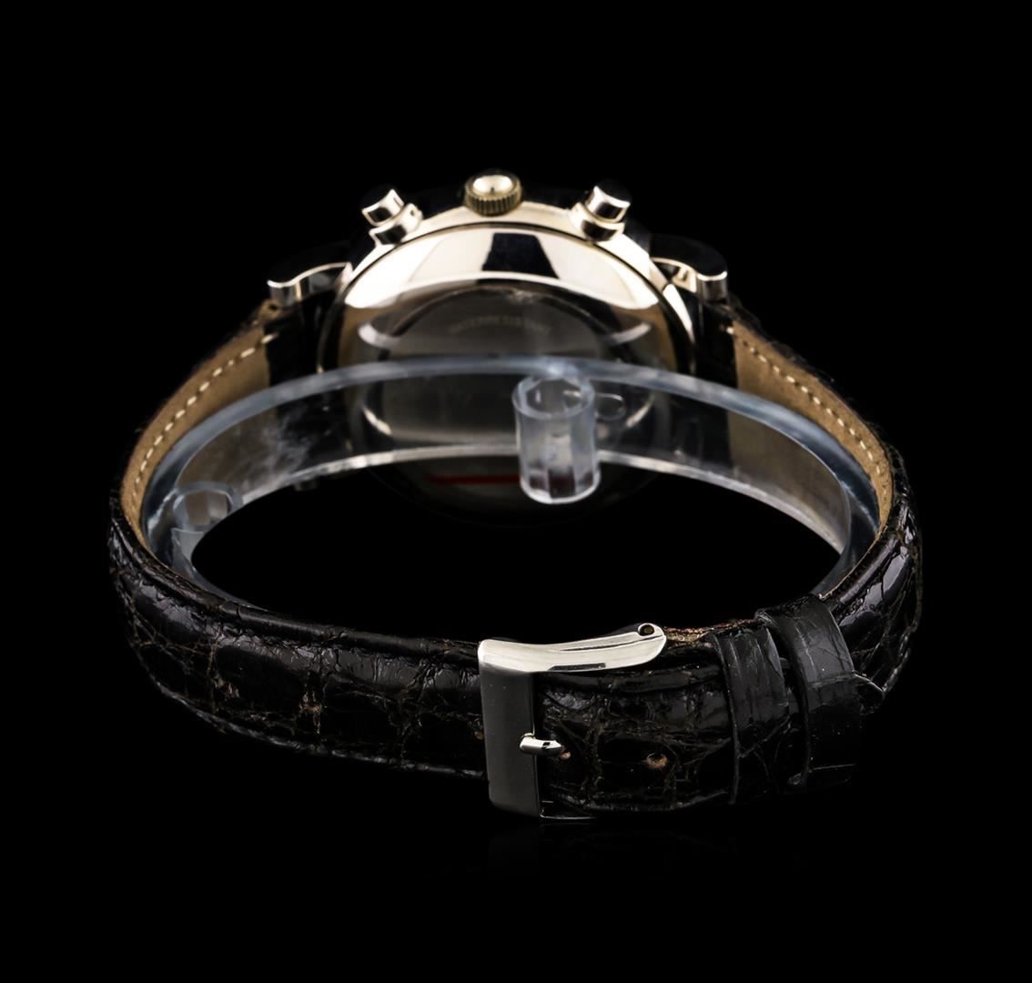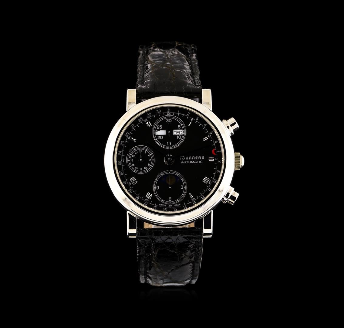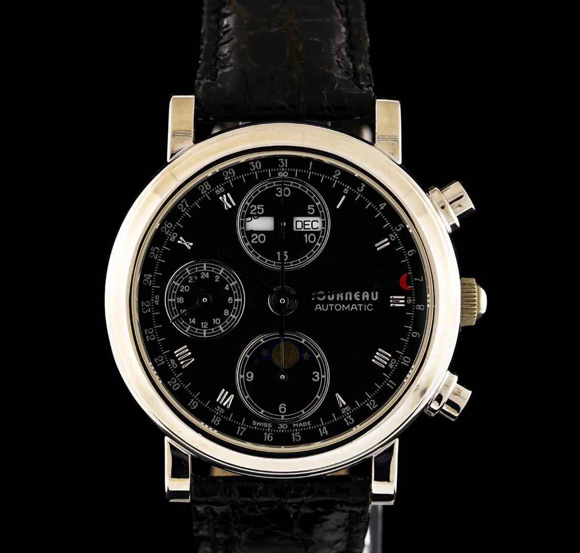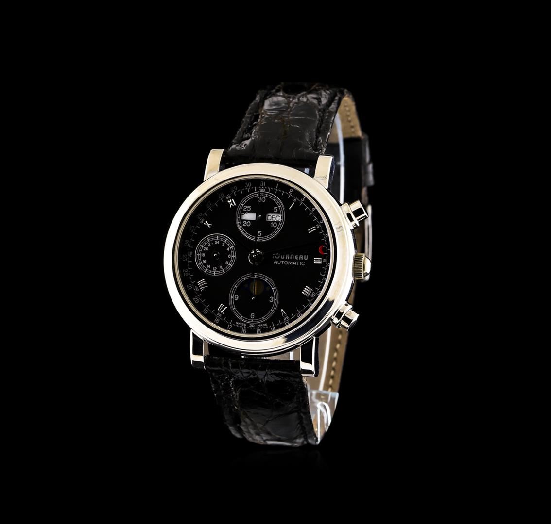One Tourneau Day-Date Moonphase Chronograph Watch featuring: Movement: Automatic. Case: 18KT White Gold. Case Size: 38mm diameter. Crystal: Sapphire. Dial: Black with roman dial markers. Features: Chronograph, date, day, day/night, month, moon phase, and second hand. Strap/Bracelet: Genuine crocodile leather handmade in Italy. Water Resistance: 30 meters. Minor surface scratches on the back of the case.