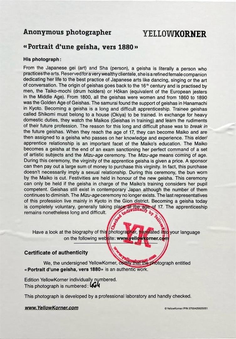Traditional Asian Portrait Dune Geisha Vers 1880 YellowKorner Certified Photograph. Certificate of Authenticity from YellowKorner affixed to the back. Matted Dimensions 16"x20". Protected with Clear Mylar Sleeve.