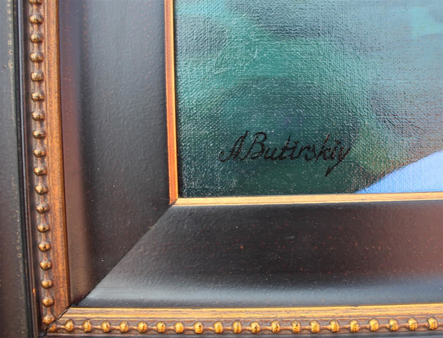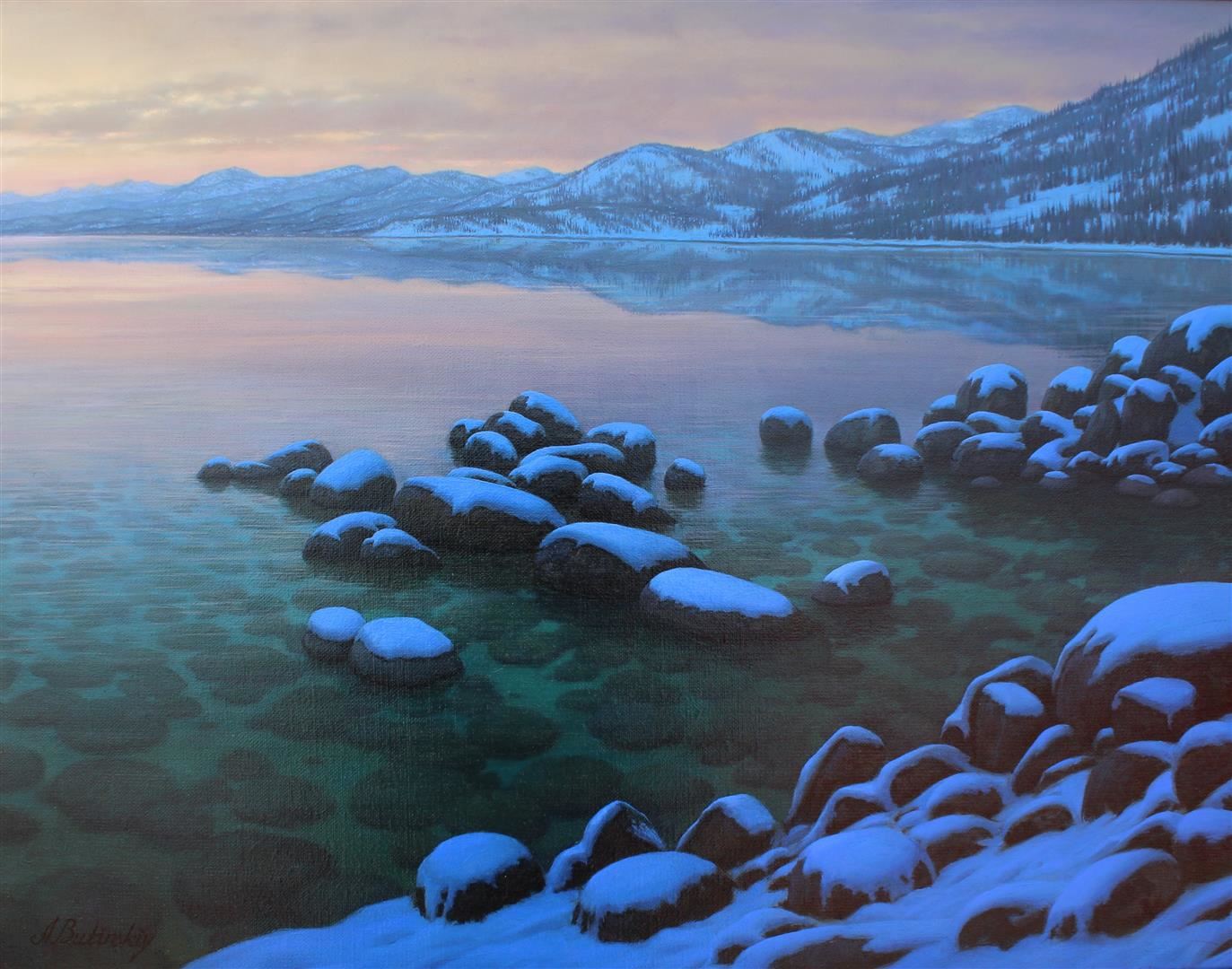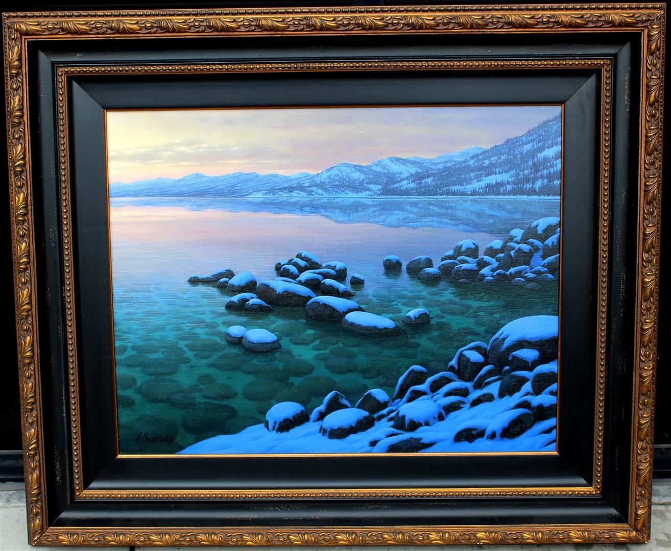 Russian Realism artist, Alexei Butirskiy, captures the serene beauty of Lake Tahoe, just as the sun sets on the snow-dusted lake front in this painting that has been exhibited at the Marietta/Cobb Museum of Art. The oil on linen measures 21.875 x 27.875; framed image measures approx. 33.875 x 39.875.