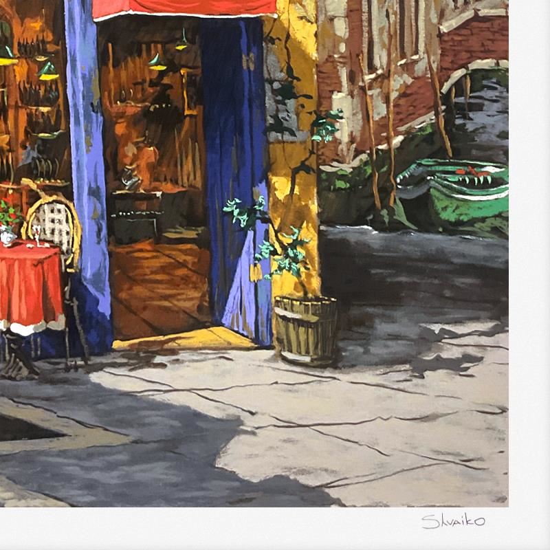 "Trattoria on the Water" is a limited edition printer's proof on paper by Viktor Shvaiko, numbered and hand signed by the artist. Includes Letter of Authenticity. Measures approx. 27" x 34" (border), 22.5" x 30" (image). There may be a minor crease in the white border area of that may be concealed when framed.