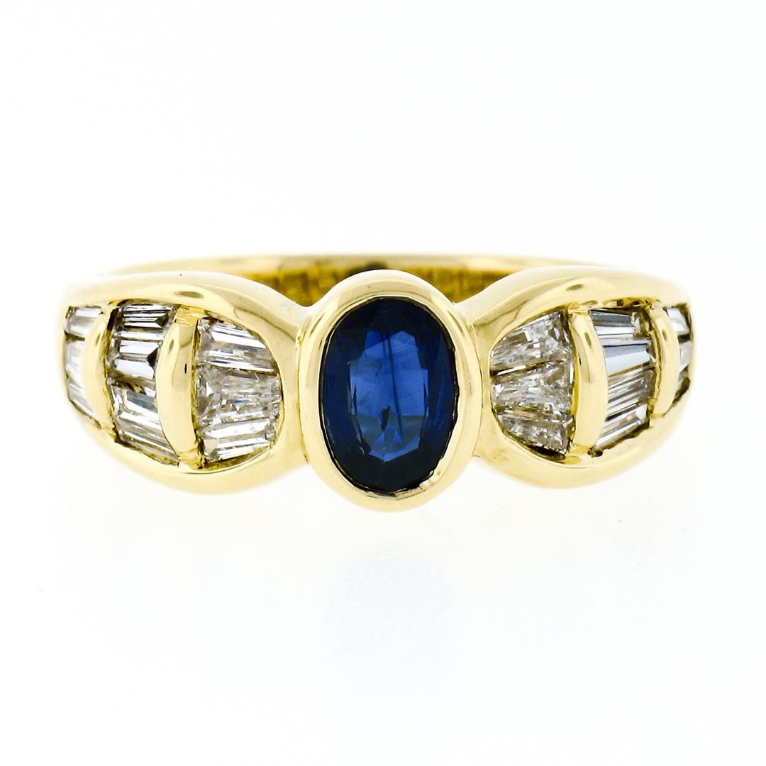 An 18k yellow gold ring made by Trevi featuring an oval cut blue sapphire (0.80ct) and 20 baguette cut diamonds (H/I - VS1/VS2; 1.10ctw). The ring is size 7.5, weighs a total of 7.46 grams, and measures 7.85mm wide.