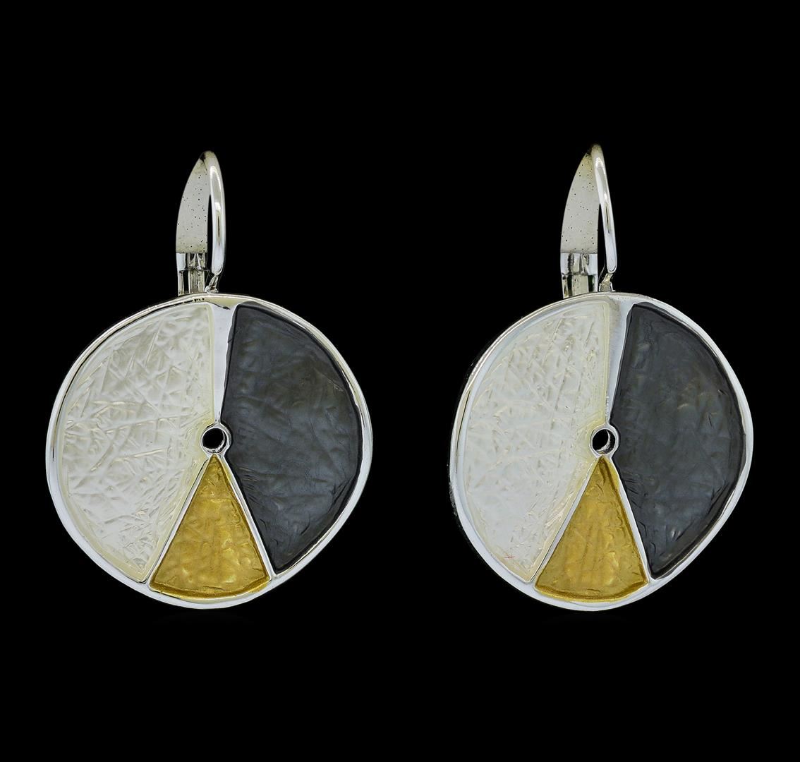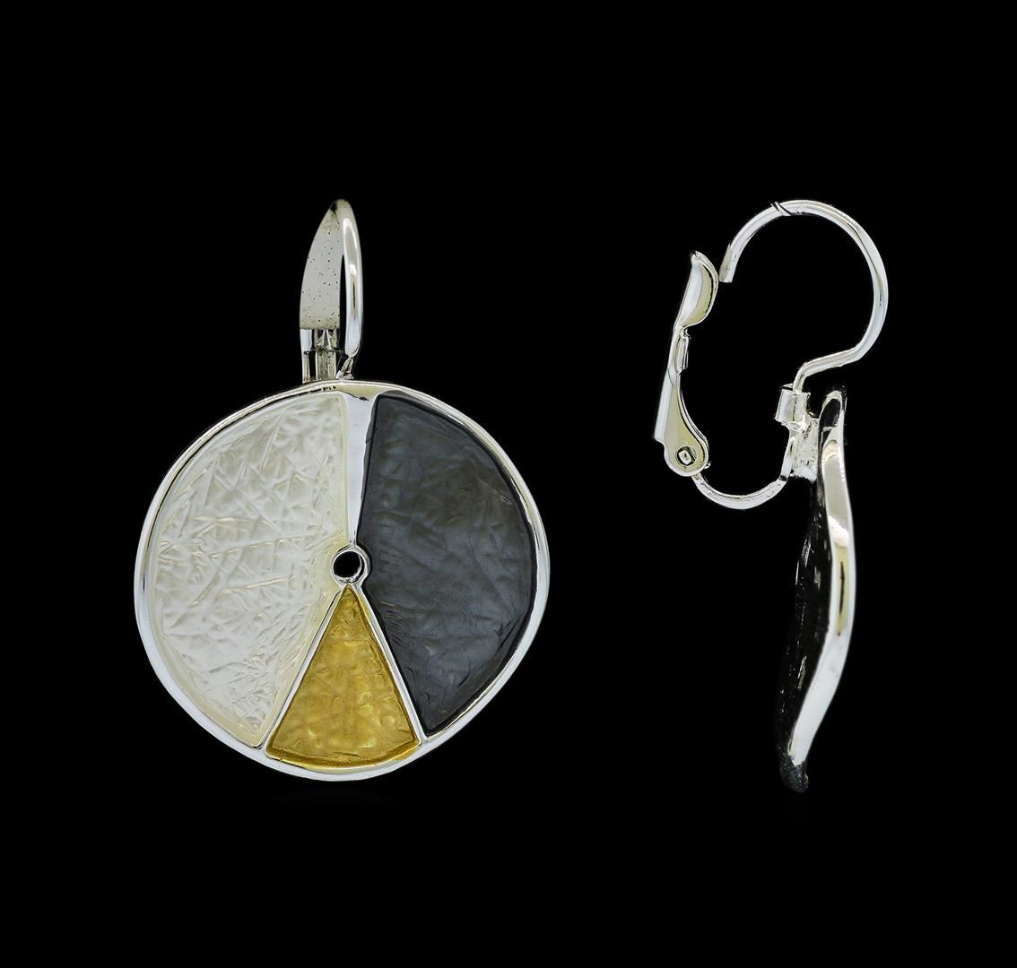 High end designer jewelry. Tri Color Hand Painted Medallion Earrings - Rhodium Plated. Rhodium Plated Metal/1.5" Dangle. Silver/ Multi. FrenchClip. Total Weight: 5.4 grams.