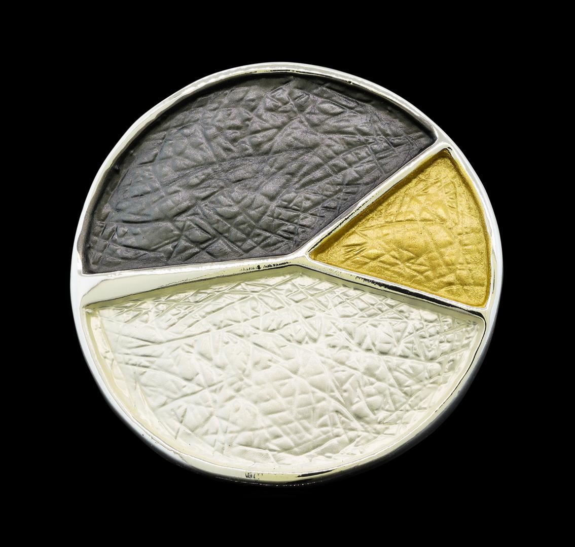 High end designer jewelry. Tri Color Hand Painted Medallion Ring - Rhodium Plated. Rhodium Plated Matte Metal. Silver/ Multi. Elastic. Total Weight: 11.7 grams.