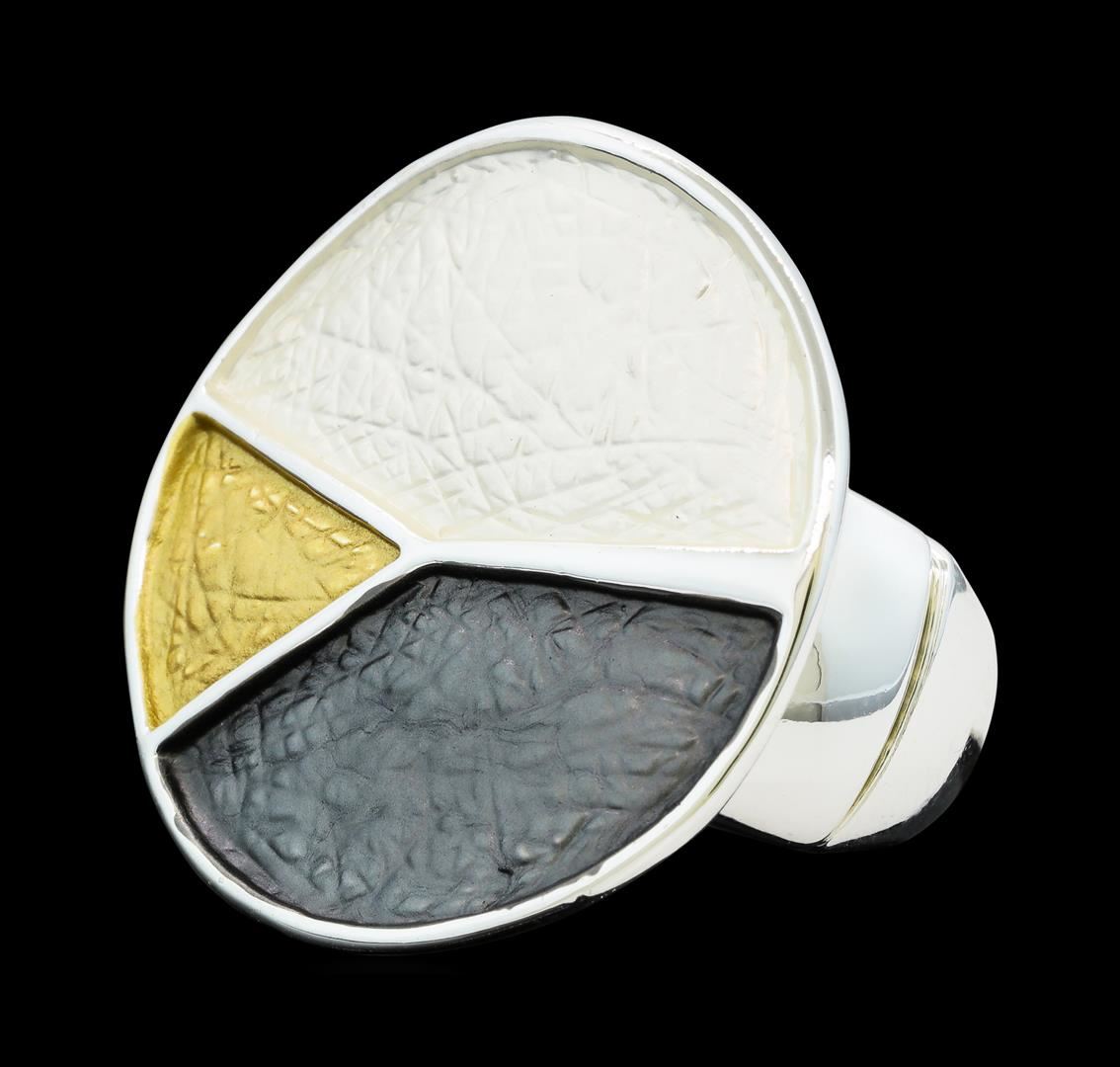High end designer jewelry. Tri Color Hand Painted Medallion Ring - Rhodium Plated. Rhodium Plated Matte Metal. Silver/ Multi. Elastic. Total Weight: 12.1 grams.