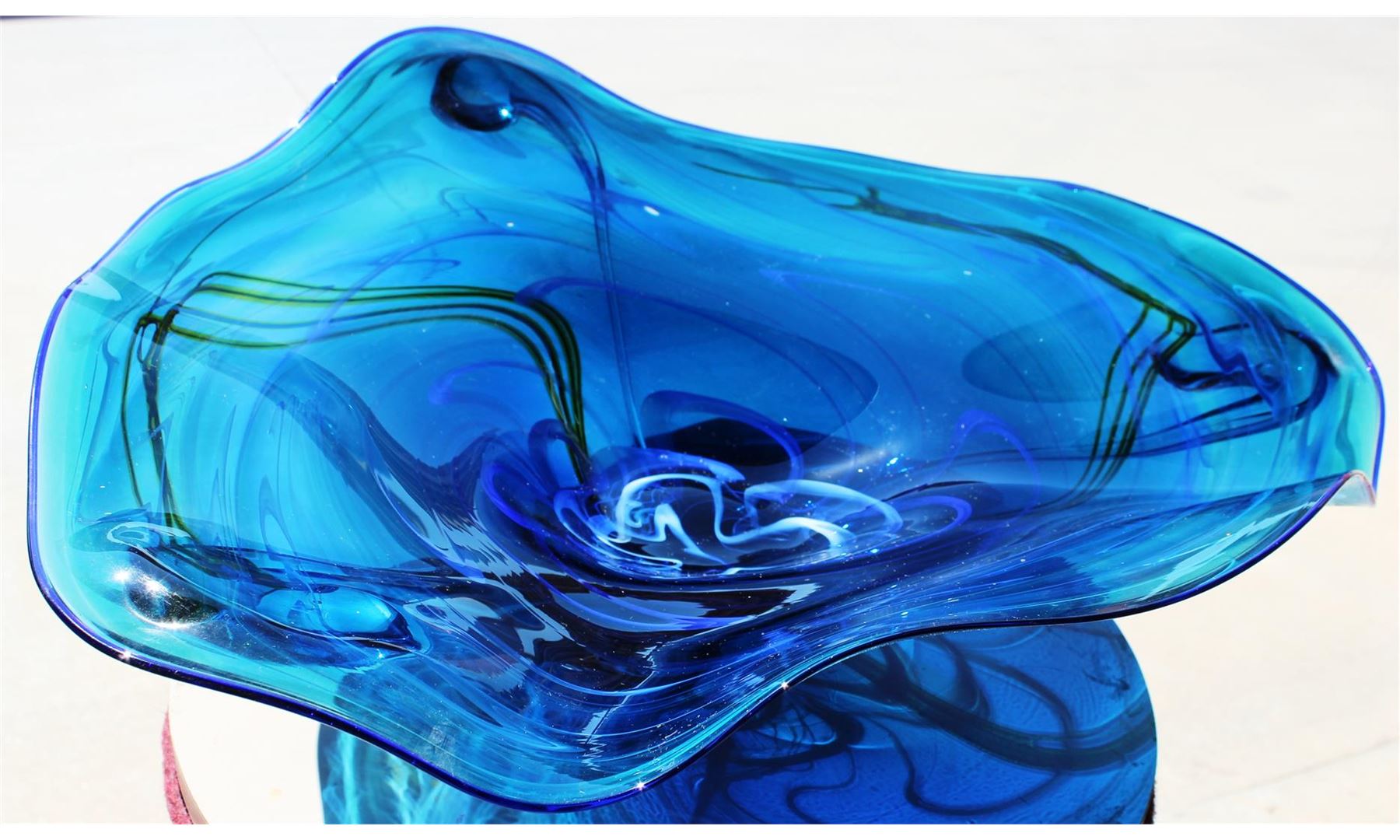 A vivid, deep blue, triangular-shaped glass bowl with swirls of green highlights is displayed by glass sculptor, Dutch Schulze. The bowl #6269 measures 22 x 8.