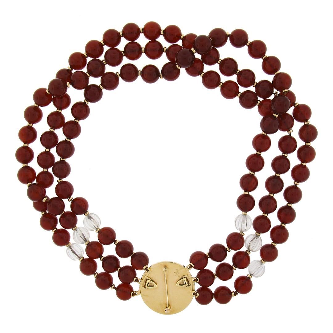 A 3 strand necklace with 14k yellow gold clasp and spacers, featuring numerous round shape natural carnelian (10mm to 10.5mm each), 6 grooved bead shape natural rock crystal (9.8mm to 10mm each), 1 round shape carved natural carnelian (18.1mm), 6 round cabochon cut natural carnelians (2.5mm each), and 1 round shape natural rock crystal (29.1mm ). It weighs a total of 167.57 grams, measures 30.5mm wide at the pendant, and measures 16 inches in length.