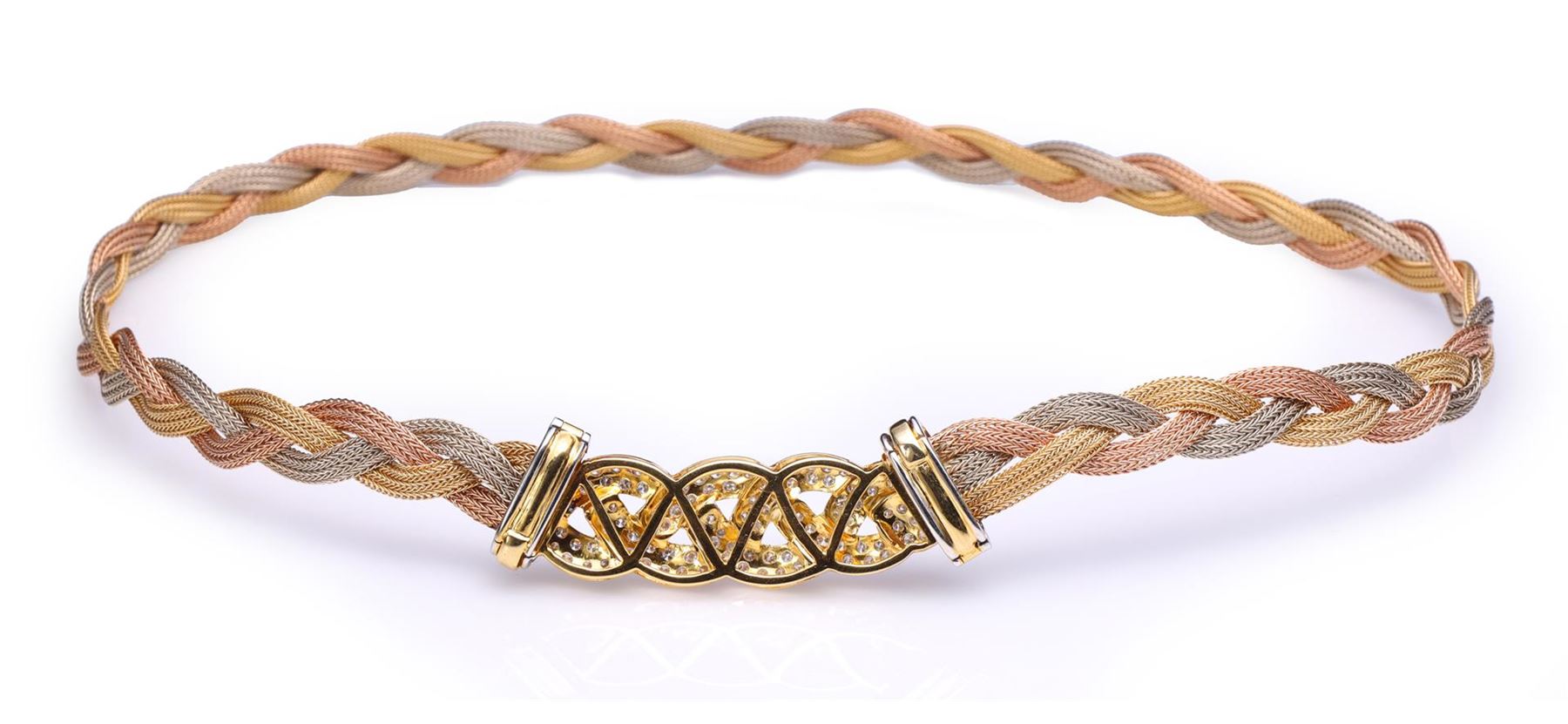 Tricolor Gold Necklace Mounted with 18K Yellow Gold and Diamond Centerpiece containing brilliant cut round diamonds weighing approximately 0.38 cts. Total weight of 172 gm. Estimated retail value $14,980
