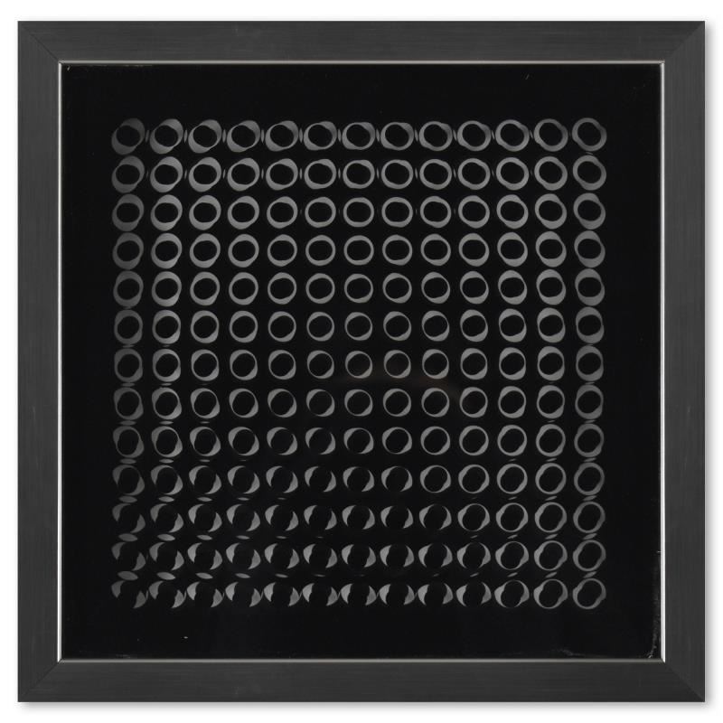 "Trois Dimensions Optique de la série Cinetiques" is a dimensional artwork, published in 1973, by Victor Vasarely (1908-1997). This piece comes custom framed, with a letter of authenticity and with a 1976 Vasarely paperback. Measures approx. 11.5" x 11.5" (frame), 9" x 9" (image).