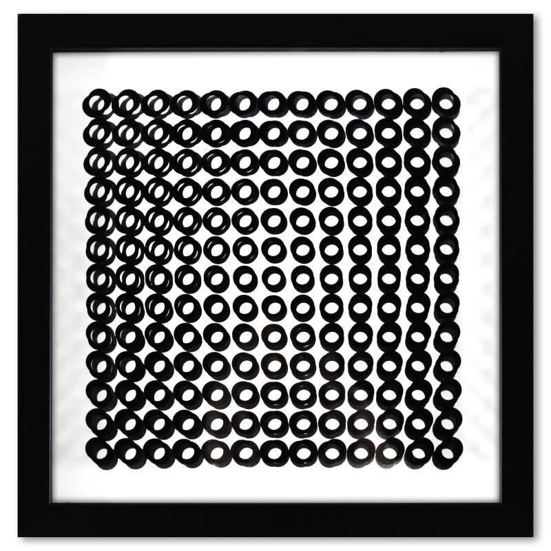 Trois Dimensions Optique de la serie Cinetiques by Vasarely (1908-1997). "Trois Dimensions Optique de la série Cinetiques" is a dimensional artwork, published in 1973, by Victor Vasarely (1908-1997). This piece comes custom framed. This piece comes with a catalogue raisonne of Vasarely's work with forward from Marcel Joray (paper back, published 1976). Includes Letter of Authenticity. Measures approx. 11.5" x 11.5" (frame), 9" x 9" (image).