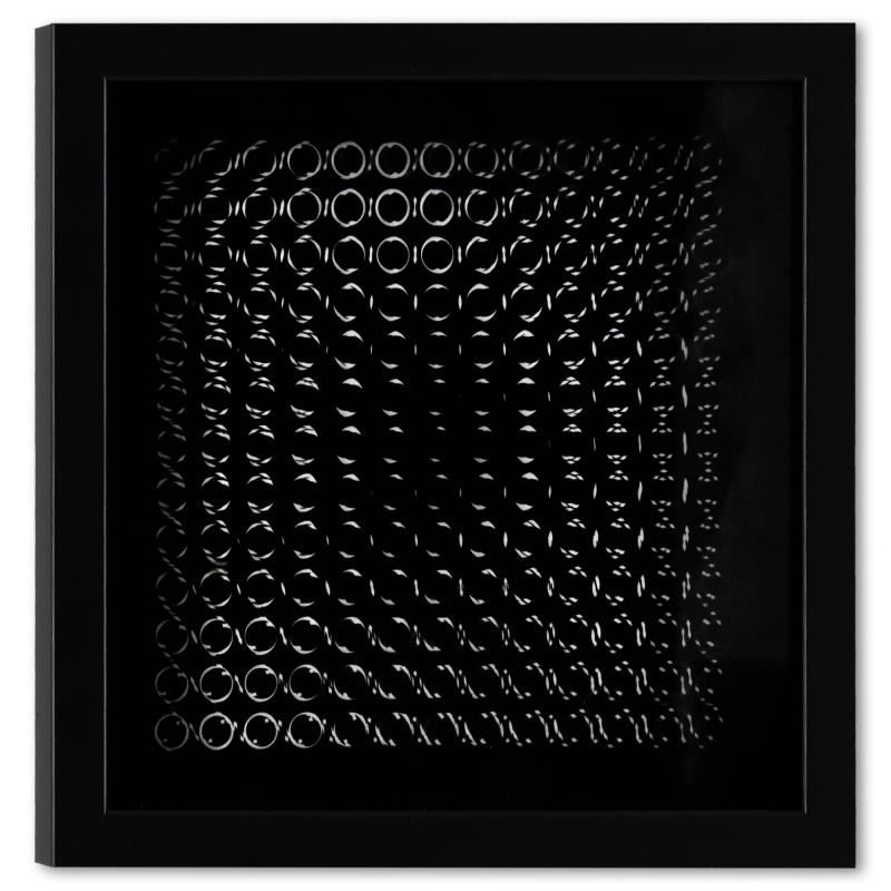 "Trois Dimensions Optique de la serie Cinetiques" is a dimensional artwork published in 1973 by Victor Vasarely (1908-1997). This piece comes custom framed. This piece comes with a catalogue raisonne of Vasarelys work with forward from Marcel Joray (paper back published 1976). Includes Letter of Authenticity. Measures approx. 11.5" x 11.5" (frame) 9" x 9" (image).