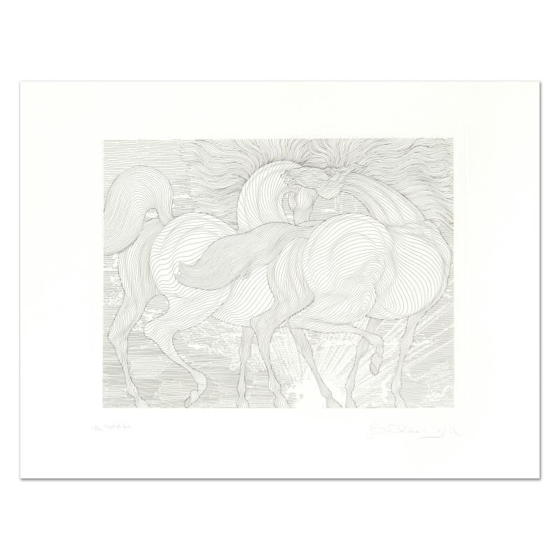"Tryst" is a limited edition etching on paper by Guillaume Azoulay! This piece is numbered and hand signed by the artist. Includes Certificate of Authenticity! Measures approx. 30" x 22" (border), 20" x 18" (image).
