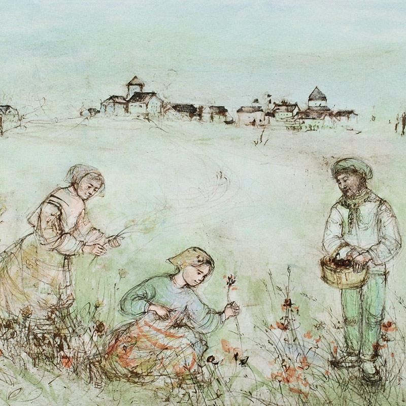 Tuscan Fields by Hibel (1917-2014). Wild lines and muted colors make Edna Hibel's art stand out in any room. "Tuscan Fields" is a limited edition lithograph on paper, numbered and hand signed by Hibel. Includes Certificate of Authenticity! Measures approx. 35" x 25" (with border) 28.5" x 18" (image).