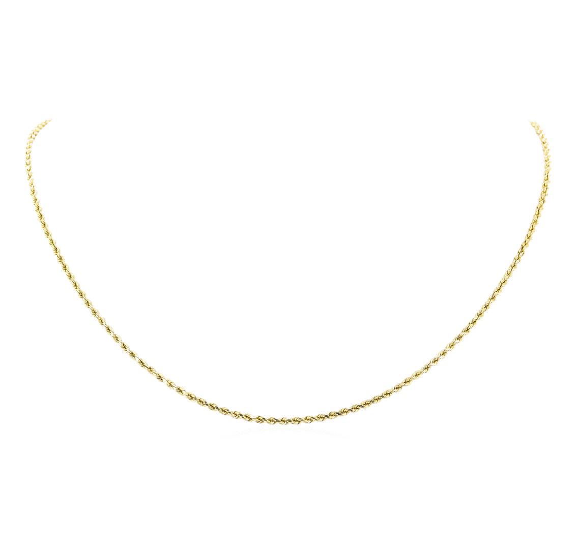 One 2.1mm wide rope chain measuring 20 inches long featuring: 14KT yellow gold weighing 9.8 grams.