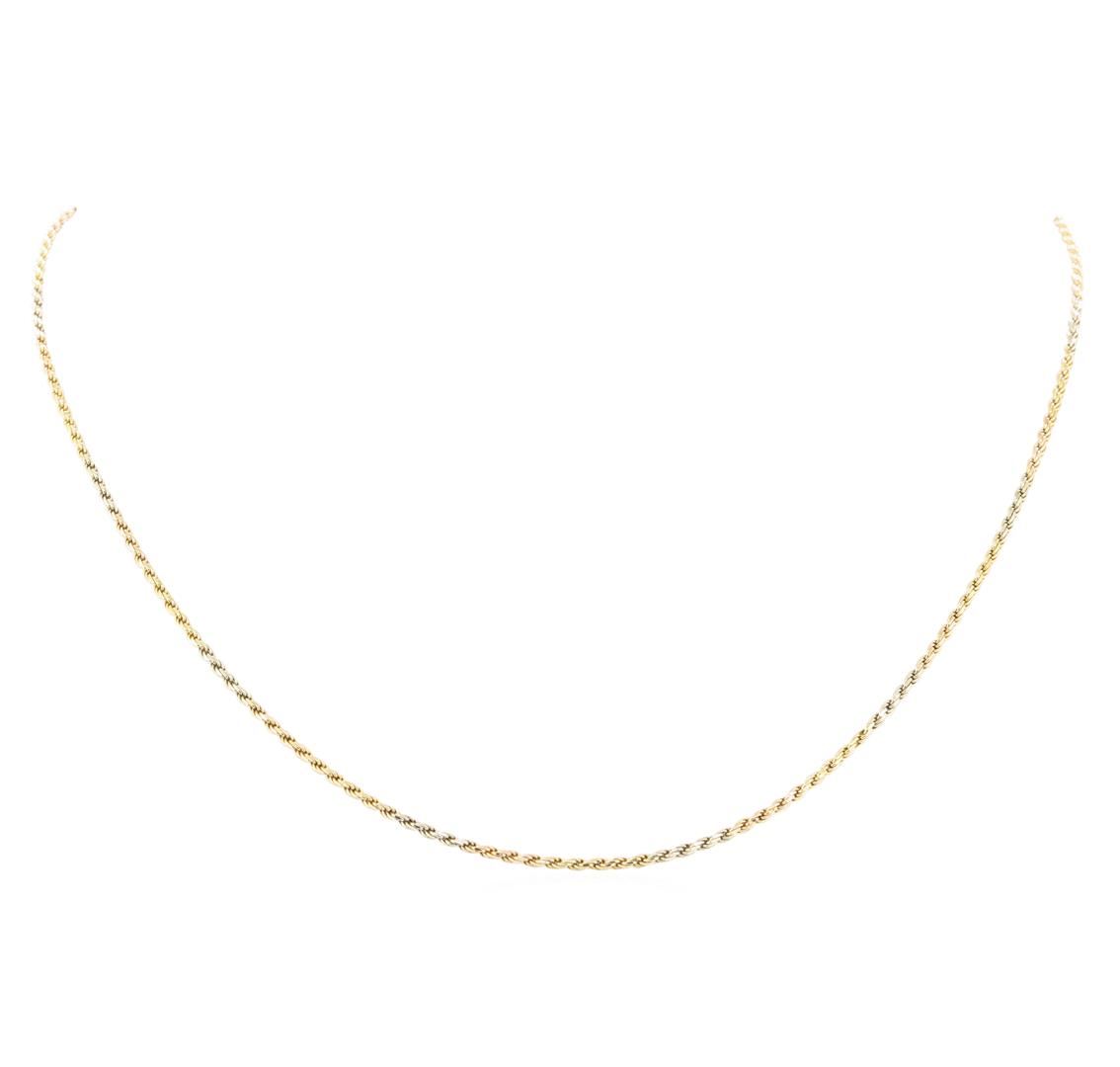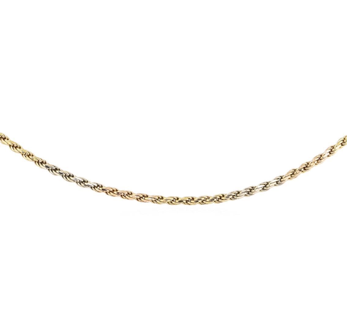 One 1.8mm wide diamond cut rope link chain measuring approximately 20 inches featuring: 14KT yellow, rose, and white gold weighing 7.3 grams.
