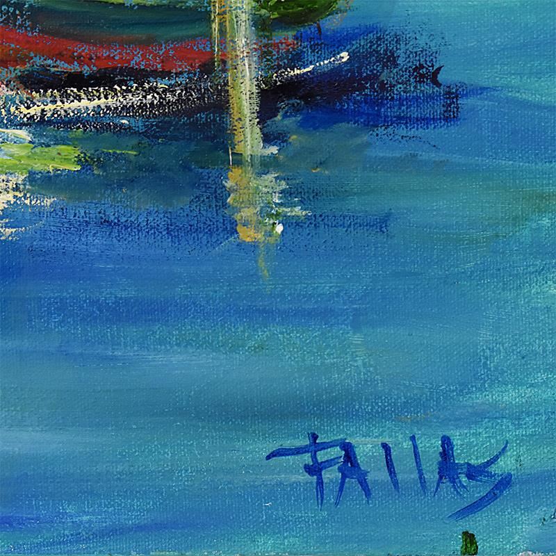 "Two Boats" is an original oil painting on board by Elliot Fallas, hand signed by the artist. Includes Letter of Authenticity. Measures approx. 16" x 20" (image). The sides of the canvas are painted and it can be hung as is, but a frame is definitely recommended.