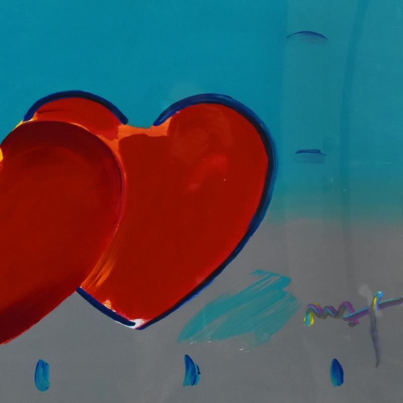 "Two Hearts As One" is a one-of-a-kind acrylic mixed media on paper, hand signed by Peter Max. This piece comes custom framed. Includes Certificate of Authenticity from Peter Max Studios. Measures approx. 46.5" x 34.5" (frame), 35" x 23" (image).