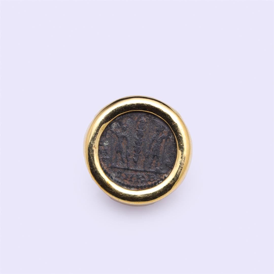 Two Imperial Roman coins mounted in 18k yellow gold as earrings; gross weight 14.6 g, each D 3/4" (approx.)