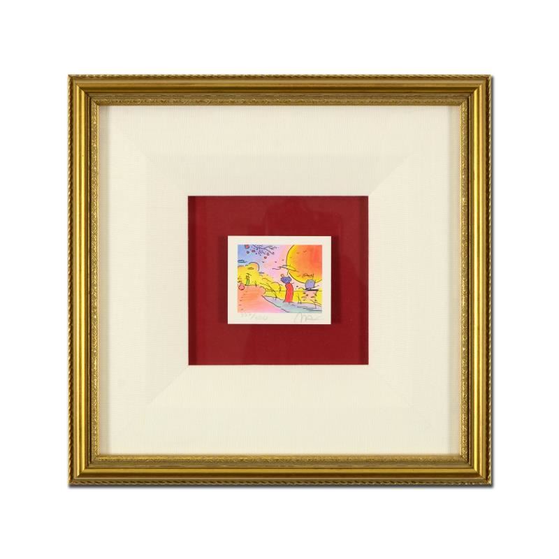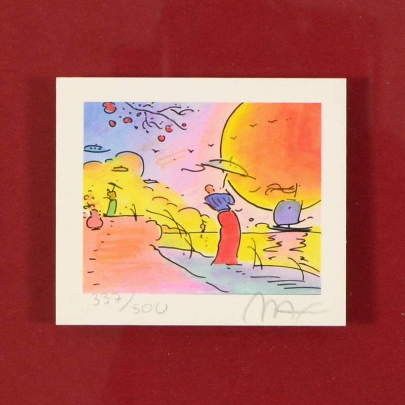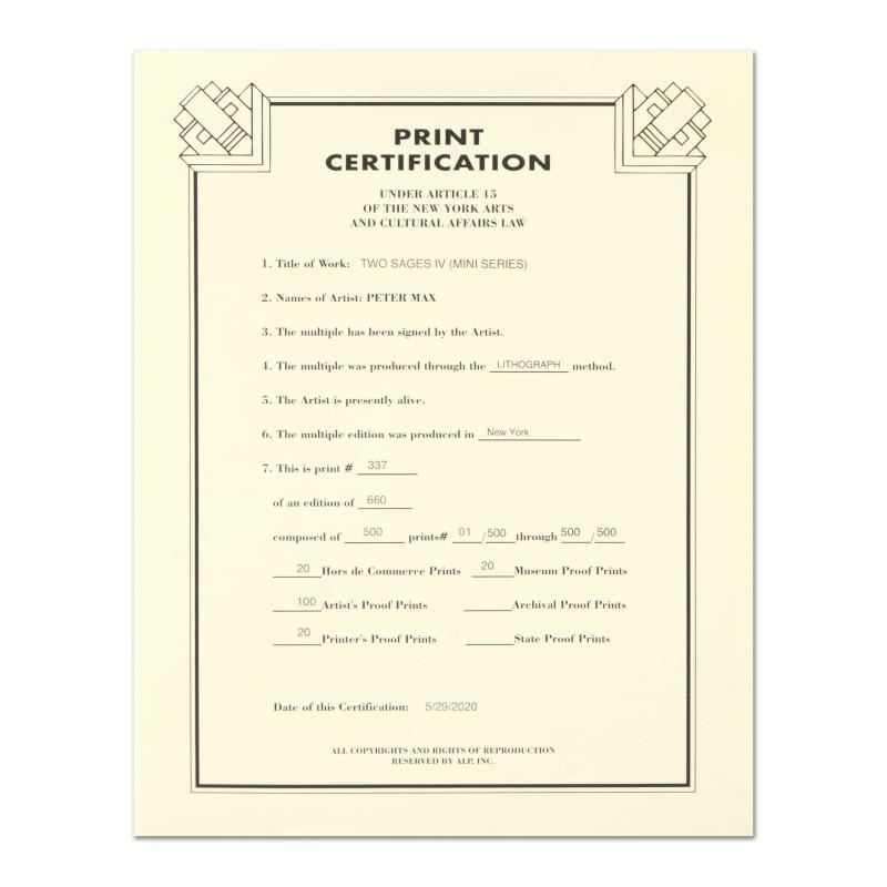 "Two Sages IV" is a limited edition lithograph on paper by Peter Max, numbered 337/500 and hand signed by the artist. This piece comes framed and includes Certificate of Authenticity. Measures approximately 13" x 13" (frame), 3" x 3" (image).