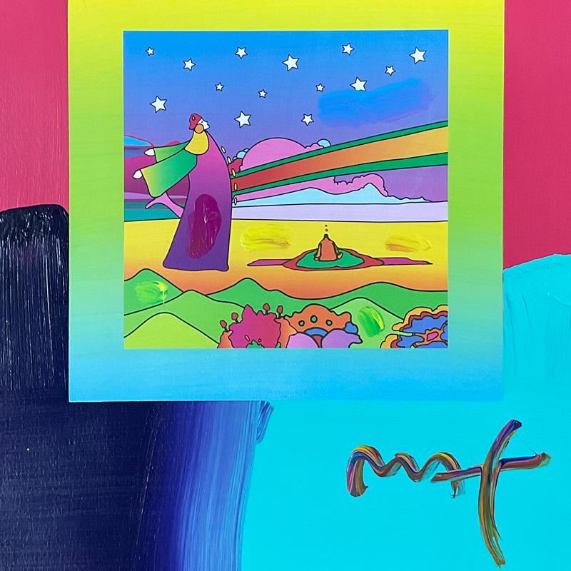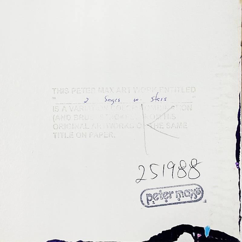 Two Sages with Stars is a one-of-a-kind acrylic mixed media on paper, hand signed by Peter Max. The piece comes custom framed with a backside cutout to display Peter Max Studio registration number 251988 certifying authenticity. Measures approx. 28 x 24 (frame), 18 x 14 (image).