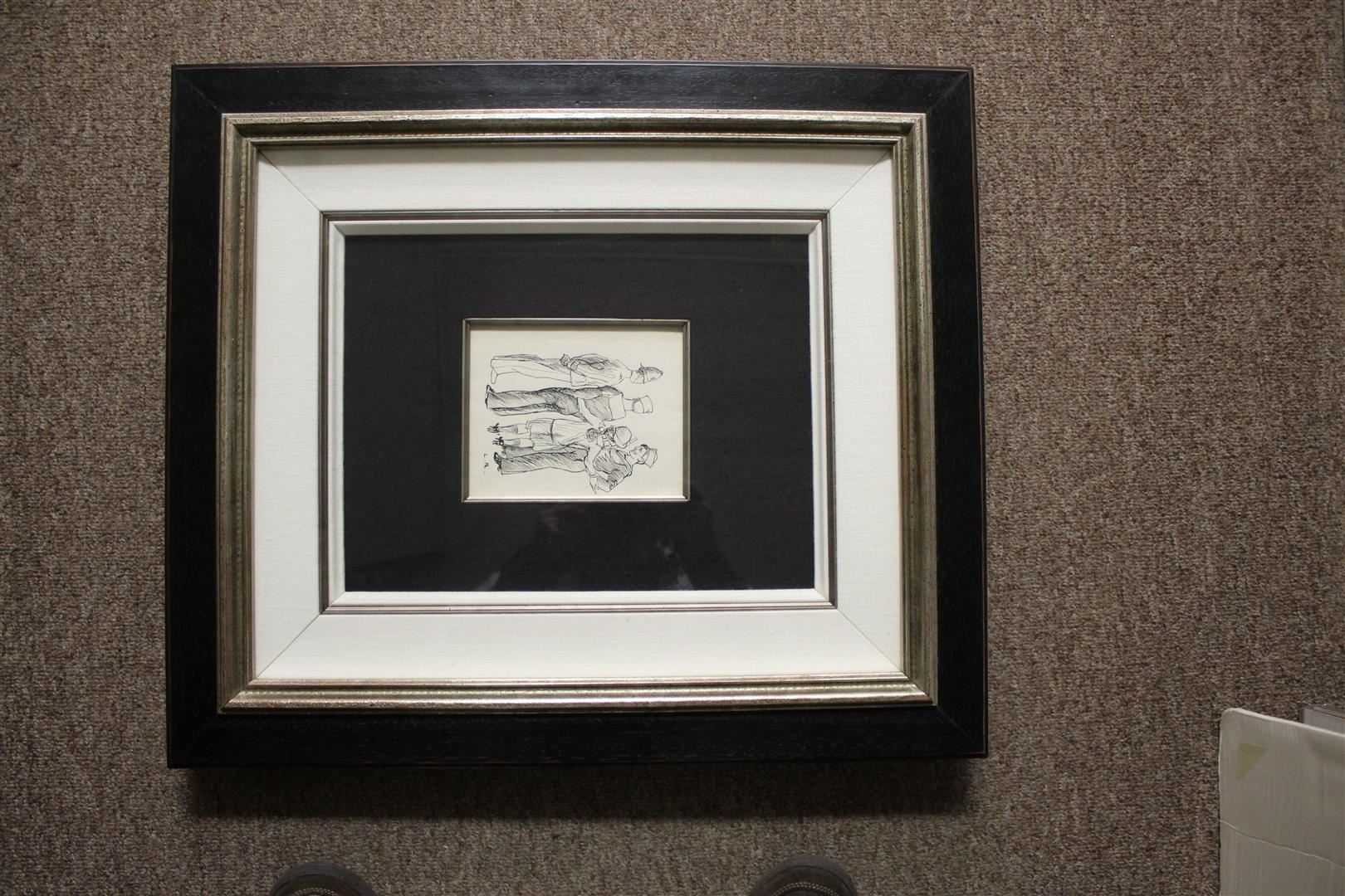 Ludovic-Rodo Pissarro charms his viewers with this pen & ink sketch on paper of a young woman chatting with two sailors and an English policeman. The drawing measures 7.25 x 5; framed image measures approx. 19.25 x 17.