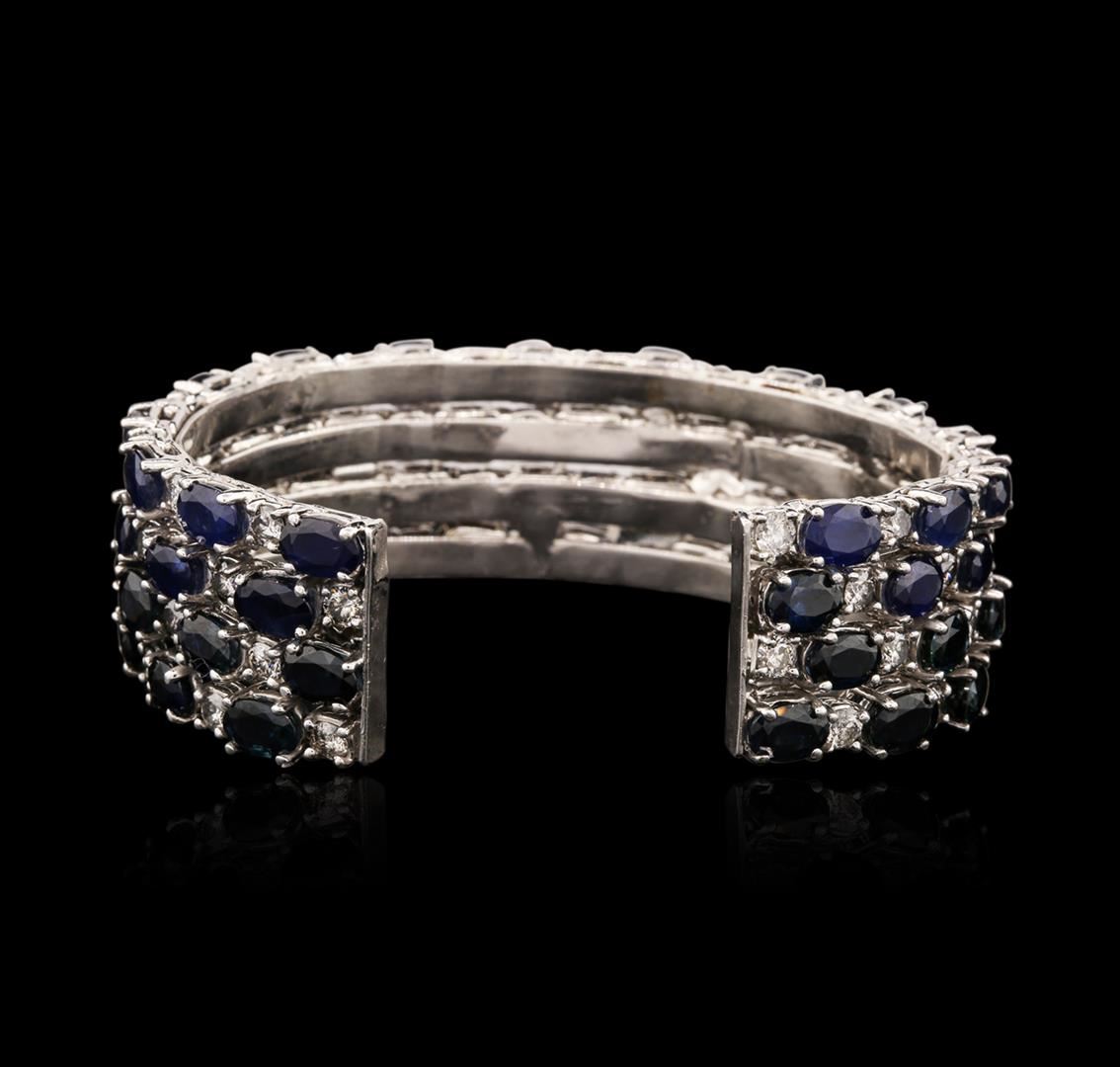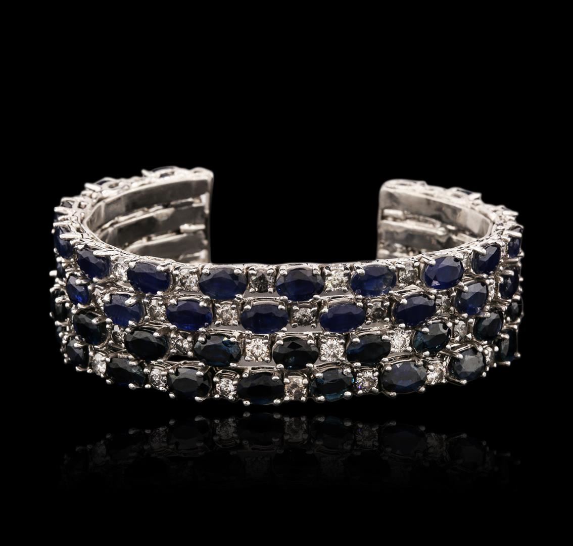One electronically tested Stainless Steel and 6KT white gold ladies cast & assembled sapphire and diamond cuff bracelet with a bright polish finish. Six-eighths of an inch wide and five and three-quarters inch wearable length cuff bracelet features four sapphire and diamond ribbons. Condition is good. Containing: Sixty prong set oval mixed cut natural blue sapphires, measuring 6.00 x 3.50 x 2.30mm, approximate total weight of 25.20ct., clarity is moderately included, type II, dark, very slightly grayish, violetish blue color, (GIA vB 7/3), cut is good. Transmitting light with a minimum of distortion, transparent. Naturally occurring internal & external characteristics are present. Measurements & the color grade are an average for the group. Indications of multiple laboratory enhancements, including high temperature heat treatment. Graded in the setting. Sixty prong set round brilliant cut diamonds, measuring 3.00 - 2.80 x 1.74mm (depth est.) approximate total weight of 60 Stones = 5.35ct. Graded in the setting. Clarity: SI-2 to I-2. Color: J - L. Total Weight of Colored Stones 25.20ct. Total Weight of Diamonds 5.35ct. Total Weight of Cuff Bracelet 48.51 grams. AIG Appraised at $16,540.00.
