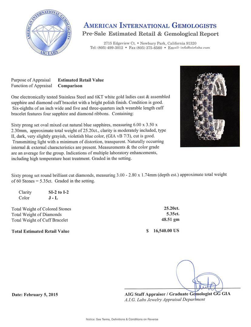 One electronically tested Stainless Steel and 6KT white gold ladies cast & assembled sapphire and diamond cuff bracelet with a bright polish finish. Six-eighths of an inch wide and five and three-quarters inch wearable length cuff bracelet features four sapphire and diamond ribbons. Condition is good. Containing: Sixty prong set oval mixed cut natural blue sapphires, measuring 6.00 x 3.50 x 2.30mm, approximate total weight of 25.20ct., clarity is moderately included, type II, dark, very slightly grayish, violetish blue color, (GIA vB 7/3), cut is good. Transmitting light with a minimum of distortion, transparent. Naturally occurring internal & external characteristics are present. Measurements & the color grade are an average for the group. Indications of multiple laboratory enhancements, including high temperature heat treatment. Graded in the setting. Sixty prong set round brilliant cut diamonds, measuring 3.00 - 2.80 x 1.74mm (depth est.) approximate total weight of 60 Stones = 5.35ct. Graded in the setting. Clarity: SI-2 to I-2. Color: J - L. Total Weight of Colored Stones 25.20ct. Total Weight of Diamonds 5.35ct. Total Weight of Cuff Bracelet 48.51 grams. AIG Appraised at $16,540.00.