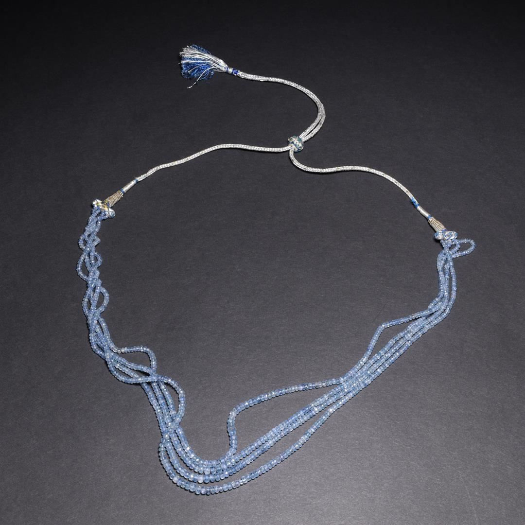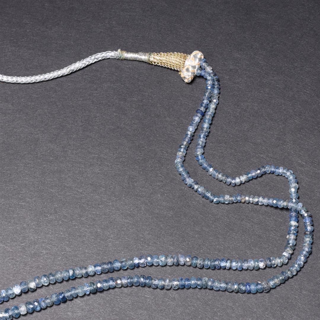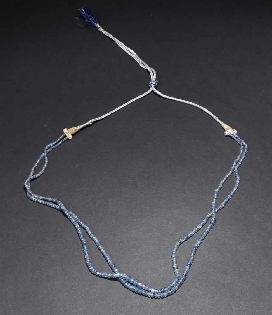 Two vintage multi-strand sapphire bead necklaces with adjustable woven cords; gross weight 81.3 g, adjustable length 16"-38" (approx.)