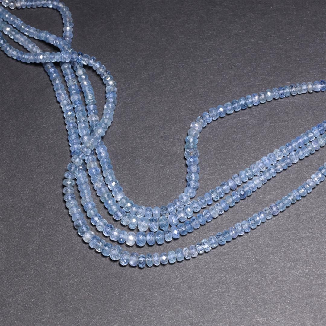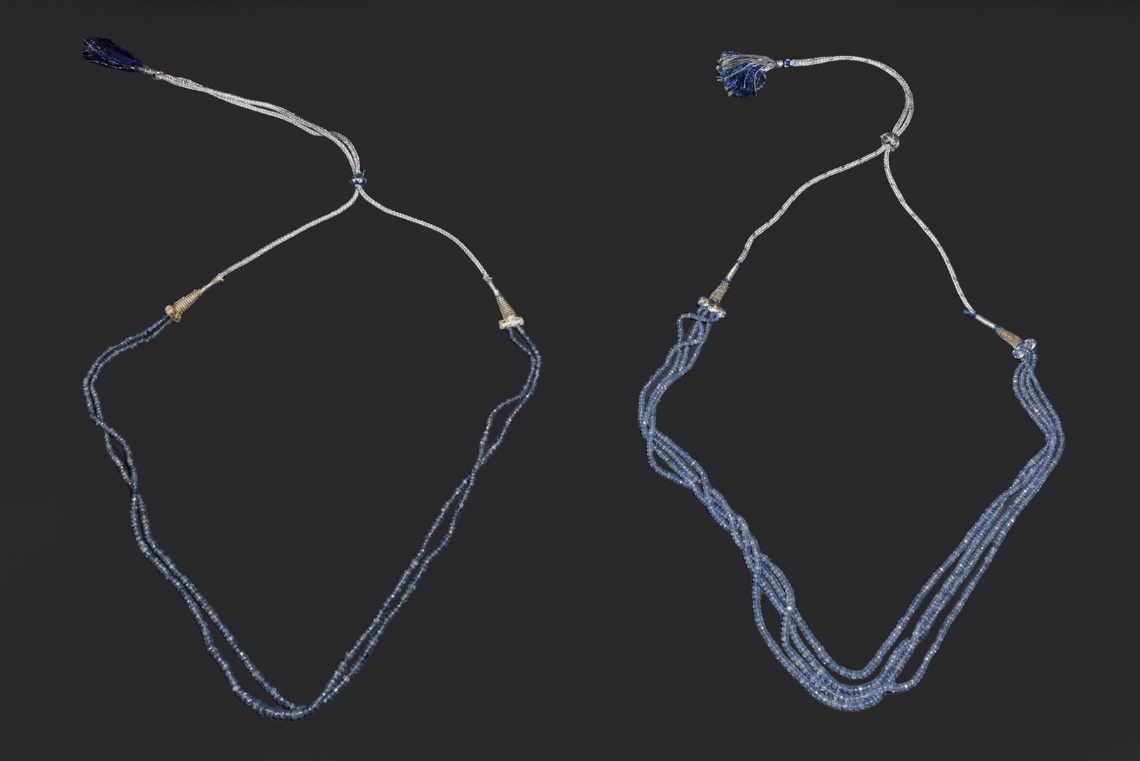 Two vintage multi-strand sapphire bead necklaces with adjustable woven cords; gross weight 81.3 g, adjustable length 16"-38" (approx.)
