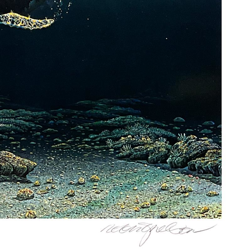 "Two Worlds Today" is a limited edition mixed media on paper by Robert Lyn Nelson, numbered and hand signed by the artist. Includes Letter of Authenticity. Measures approx. 21" x 35" (border), 16.5" x 30" (image). There may be minor imperfections on the paper but the piece is in overall good condition.