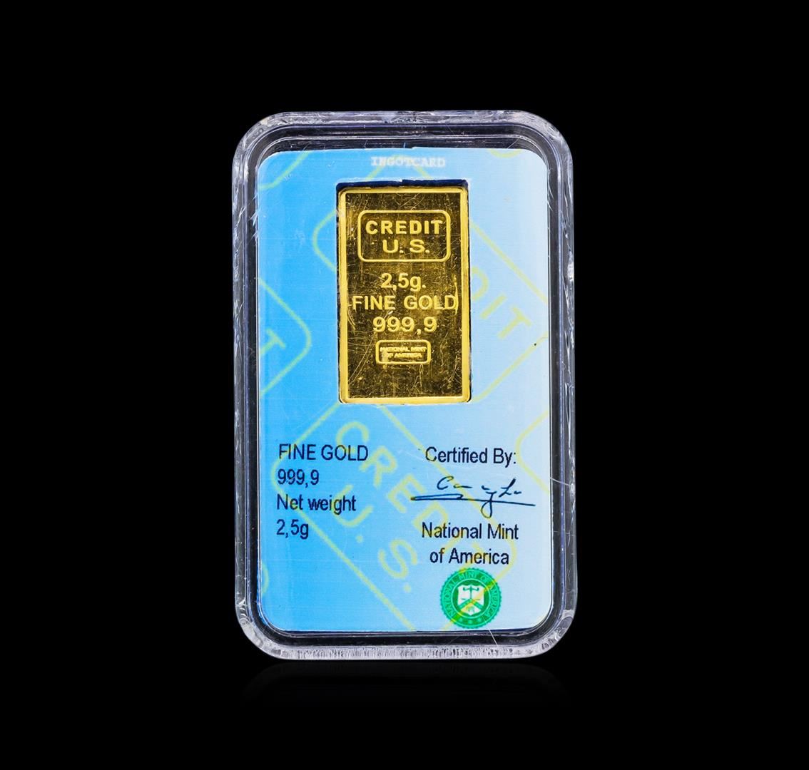 U.S. Credit 2.5G 999.9 Fine Gold. Total Weight: 2.5 grams.