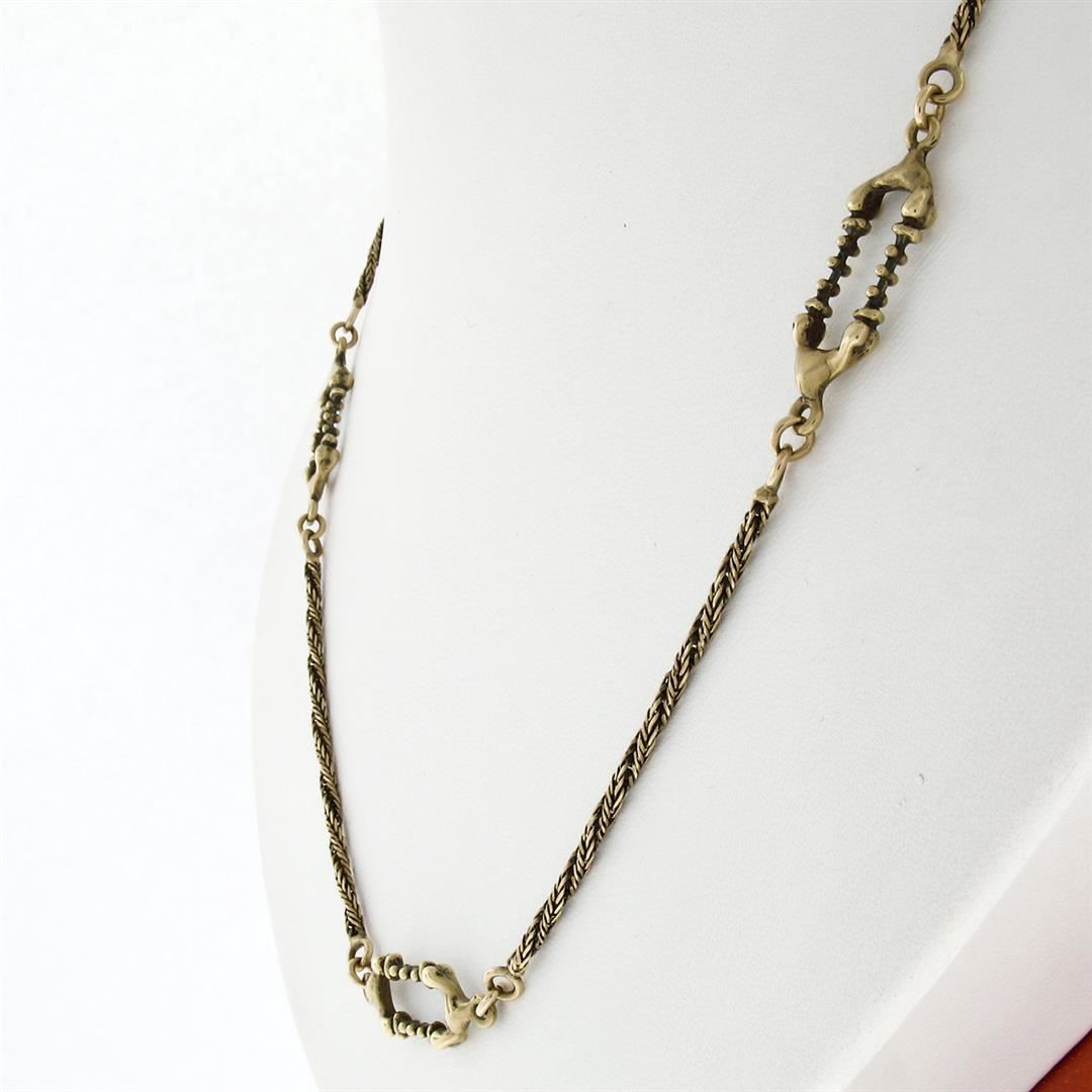 A vintage solid 18k yellow gold chain necklace. 20 inch unique twisted and open bar link chain, 16.08 grams total weight.