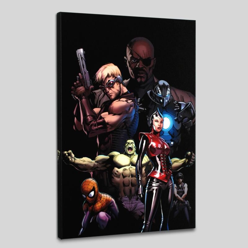 A piece of comic book history, this limited edition, from original art by Carlos Pacheco, depicts a compilation of characters, including: Red Wasp, Hulk, Spider-Man, Hawkeye, Nick Fury and War Machine. Pacheco first got attention in the United States for his work as penciller on Dark Guard, a Marvel UK title. This led to him being offered work by American comic editors leading to Marvel Comics' 1994 Bishop. Pacheco's art had become a fan favorite, with his work regularly getting coverage in magazines such as Wizard. In early 1997 Marvel acknowledged this by assigning Pacheco to one of its flagship titles, X-Men. In 2009, Pacheco signed an exclusive contract with Marvel. "Ultimate Avengers #3" is a limited edition numbered giclee on stretched canvas by Carlos Pacheco presented by Marvel Comics. This piece comes gallery wrapped. Includes Certificate of Authenticity! Measure approx. 18" x 27" (image); 1.5" (depth).