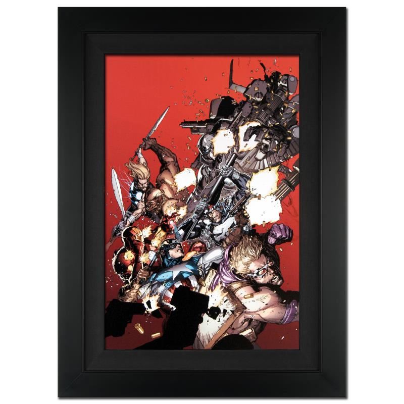 A piece of comic book history, this limited edition, from original art by Leinil Francis Yu, depicts Hawkeye, Captain America, Punisher, Iron Man, War Machine, Thor, an Tyrone Cash. After winning the Wizard's Drawing Board Contest, Marvel Comics hired Leinil Francis Yu to work on the Wolverine series. After his run on Wolverine, he moved on to work on Marvel's core X-Men title in 2000. Yu continued to work on other Marvel titles such as Fantastic Four, Ultimate Wolverine vs. Hulk and New Avengers. "Ultimate Avengers Vs. New Ultimates #1" is a limited edition giclee on canvas by Leinil Francis Yu presented by Marvel Comics, hand signed by the great Stan Lee and numbered out of only 10! This piece has been custom framed and ready to hang. Includes Certificate of Authenticity! Measures approx. 25" x 34" (with frame); 18" x 27" (image).