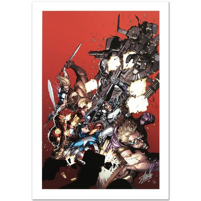 A piece of comic book history, this limited edition, from original art by Leinil Francis Yu, depicts Hawkeye, Captain America, Punisher, Iron Man, War Machine, Thor, an Tyrone Cash. After winning the Wizard's Drawing Board Contest, Marvel Comics hired Leinil Francis Yu to work on the Wolverine series. After his run on Wolverine, he moved on to work on Marvel's core X-Men title in 2000. Yu continued to work on other Marvel titles such as Fantastic Four, Ultimate Wolverine vs. Hulk and New Avengers. "Ultimate Avengers Vs. New Ultimates #1" is a numbered limited edition giclee on canvas by Leinil Francis Yu presented by Marvel Comics, hand signed by the great Stan Lee! Includes Certificate of Authenticity! Measures approx. 18" x 27" (image).