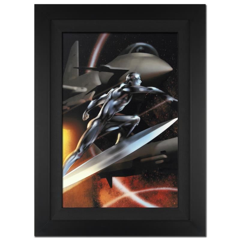 A piece of comic book history, this limited edition, from original art by Pasqual Ferry, depicts the classic character of the Silver Surfer. Known for his work on Heroes for Hire, Action Comics and Adam Strange, Pasqual Ferry is now the new artist for Marvel's Ultimate Fantastic Four. "Ultimate Fantastic Four #44" is an extremely limited edition giclee on canvas by Pasqual Ferry presented by Marvel Comics, hand signed by the great Stan Lee and numbered out of only 4! This piece comes custom framed and ready to hang. Includes Certificate of Authenticity! Measure approx. 29" x 40" (with frame), 22" x 33" (image).