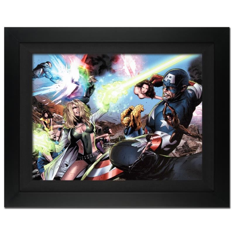 A piece of comic book history, this limited edition, from original art by Greg Land, depicts Scarlet Witch, Captain America, Thing, Wasp, Shadowcat, Power Princess, Arcanna, Dr. Spectrum, Nighthawk, and Tom Thumb. Greg Land got his start as an illustrator for an independent publisher. After landing a job at Marvel, Land has produced illustrations for X-Men and the Fantastic Four, among others. "Ultimate Power #6" is an extremely limited edition giclee on canvas by Greg Land presented by Marvel Comics, hand signed by the great Stan Lee and numbered out of only 4! This piece comes custom framed and ready to hang. Includes Certificate of Authenticity! Measures approx. 36" x 29" (with frame), 29" x 22" (image).