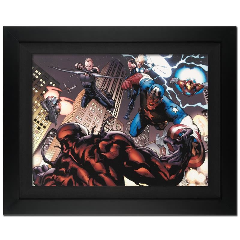 A piece of comic book history, this limited edition, from original art by Stuart Immonen, depicts Hawkeye, Captain America and, Venom. Stuart Immonen is a Canadian comic book artist. He is best known for his work on Nextwave, Ultimate X-Men, The New Avengers and Ultimate Spider-Man. Immonen studied at Toronto's York University, pursuing a career in art. In 1988, he self-published a series called Playground; it was his first published work. He worked at several smaller comic book companies before being hired by DC Comics and Marvel Comics in 1993. "Ultimate Spider-Man #126" is an extremely limited edition numbered giclee on canvas by Stuart Immonen presented by Marvel Comics, hand signed by the great Stan Lee and numbered out of only 10! This piece has been custom framed and ready to hang. Includes Certificate of Authenticity! Measure approx. 31" x 25" (with frame); 24" x 18" (image).
