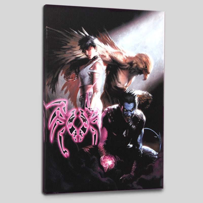 A piece of comic book history, this limited edition, from original art by Gabriele Dell'Otto, depicts an intense trio of Nightcrawler, Angel and Dazzler. In 1998 Dell'Otto started collaborating with the European division of Marvel Comics, producing covers, posters and lithographies for Italy, France and Germany. In 2002, his work was shown to the editor-in-chief of Marvel Comics, who entrusted to him with the art for the Secret War mini-series. "Ultimate X-Men #95" is a limited edition numbered giclee on canvas by Gabriele Dell'Otto presented by Marvel Comics. This piece comes gallery wrapped. Includes Certificate of Authenticity! Measures approx. 18" x 27" (image); 1.5" (depth).