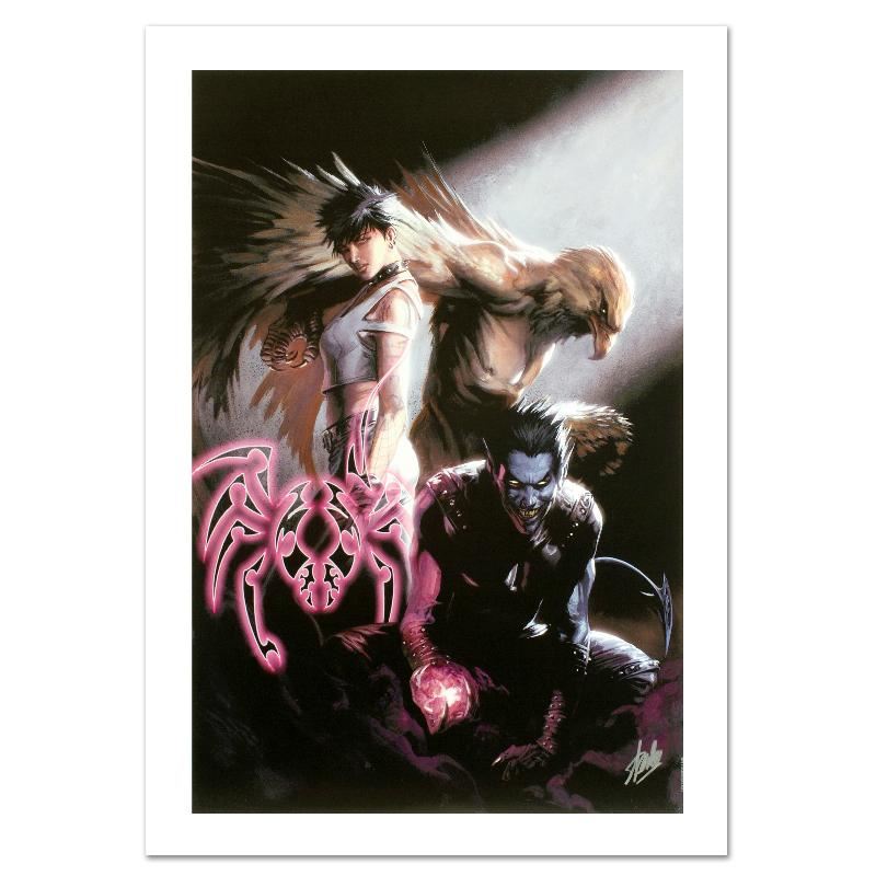 A piece of comic book history, this limited edition, from original art by Gabriele Dell'Otto, depicts an intense trio of Nightcrawler, Angel and Dazzler. In 1998 Dell'Otto started collaborating with the European division of Marvel Comics, producing covers, posters and lithographies for Italy, France and Germany. In 2002, his work was shown to the editor-in-chief of Marvel Comics, who entrusted to him with the art for the Secret War mini-series. "Ultimate X-Men #95" is a limited edition giclee on canvas by Gabriele Dell'Otto presented by Marvel Comics, numbered and hand signed by Stan Lee. Includes Certificate of Authenticity! Measures approx. 18" x 27" (image).