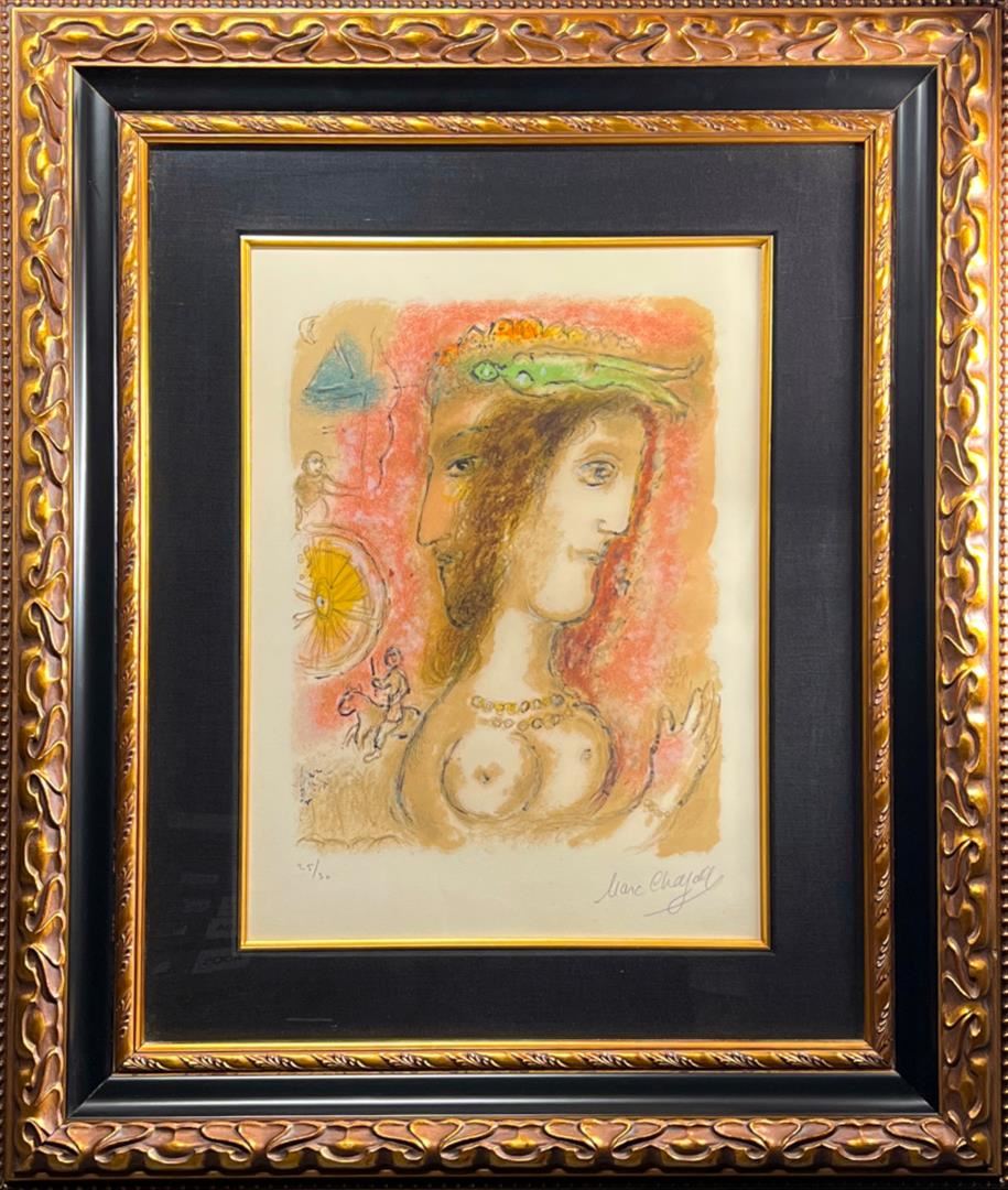 Ulysses and Penelope from The Odyssea II Volume by Chagall, Marc. Limited Hand Signed Serigraph on Paper Framed. Frame good. Dimensions: 21 x 15. Excellent Condition.