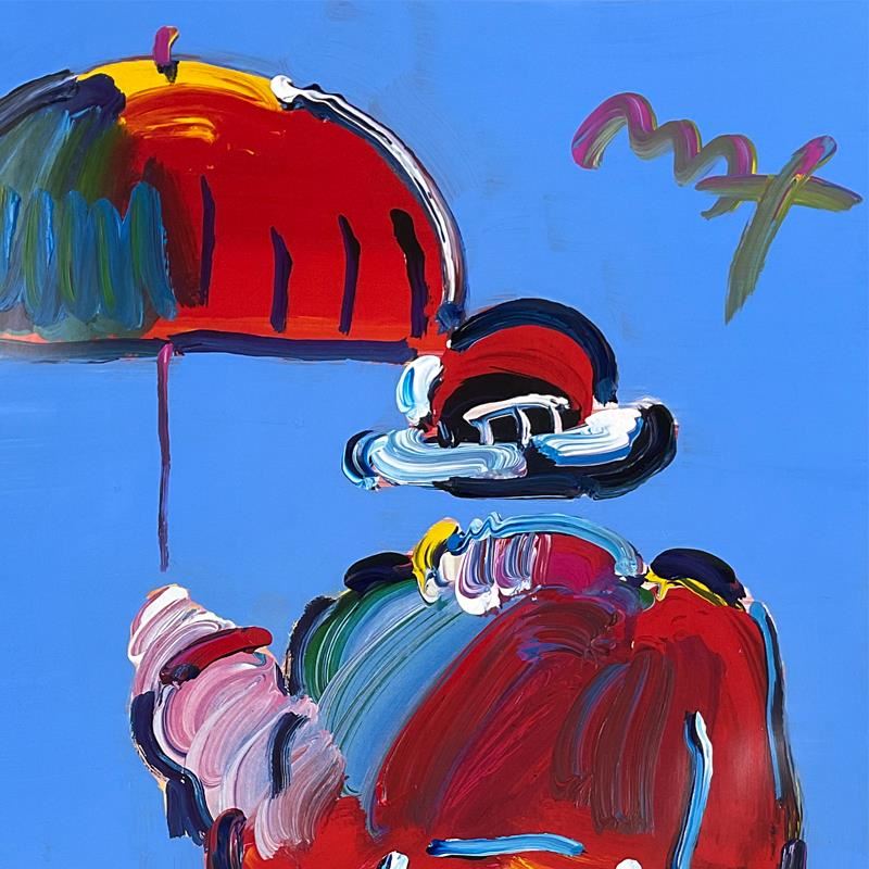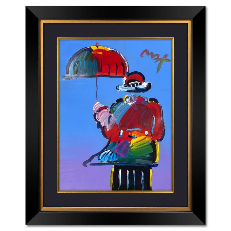 "Umbrella Man" is a one-of-a-kind acrylic mixed media on paper, hand signed by Peter Max. The piece comes custom framed with a backside cutout to display Peter Max Studio registration number 254855 certifying authenticity. Measures approx. 44.5" x 36.5" (frame), 31" x 23" (image).