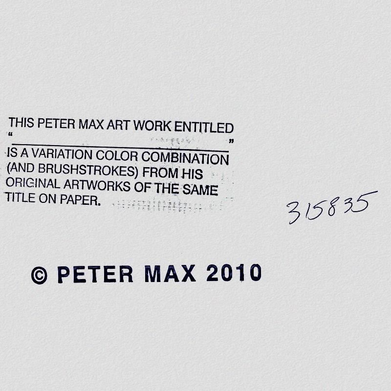 "Umbrella Man" is a one-of-a-kind mixed media on paper, hand signed by Peter Max. The piece comes custom framed with a backside cutout to display Peter Max Studio registration number 315835 certifying authenticity. Measures approximately 38.5" x 30" (frame), 32.5" x 24" (image). This item requires special handling and may have a longer than usual turnaround.