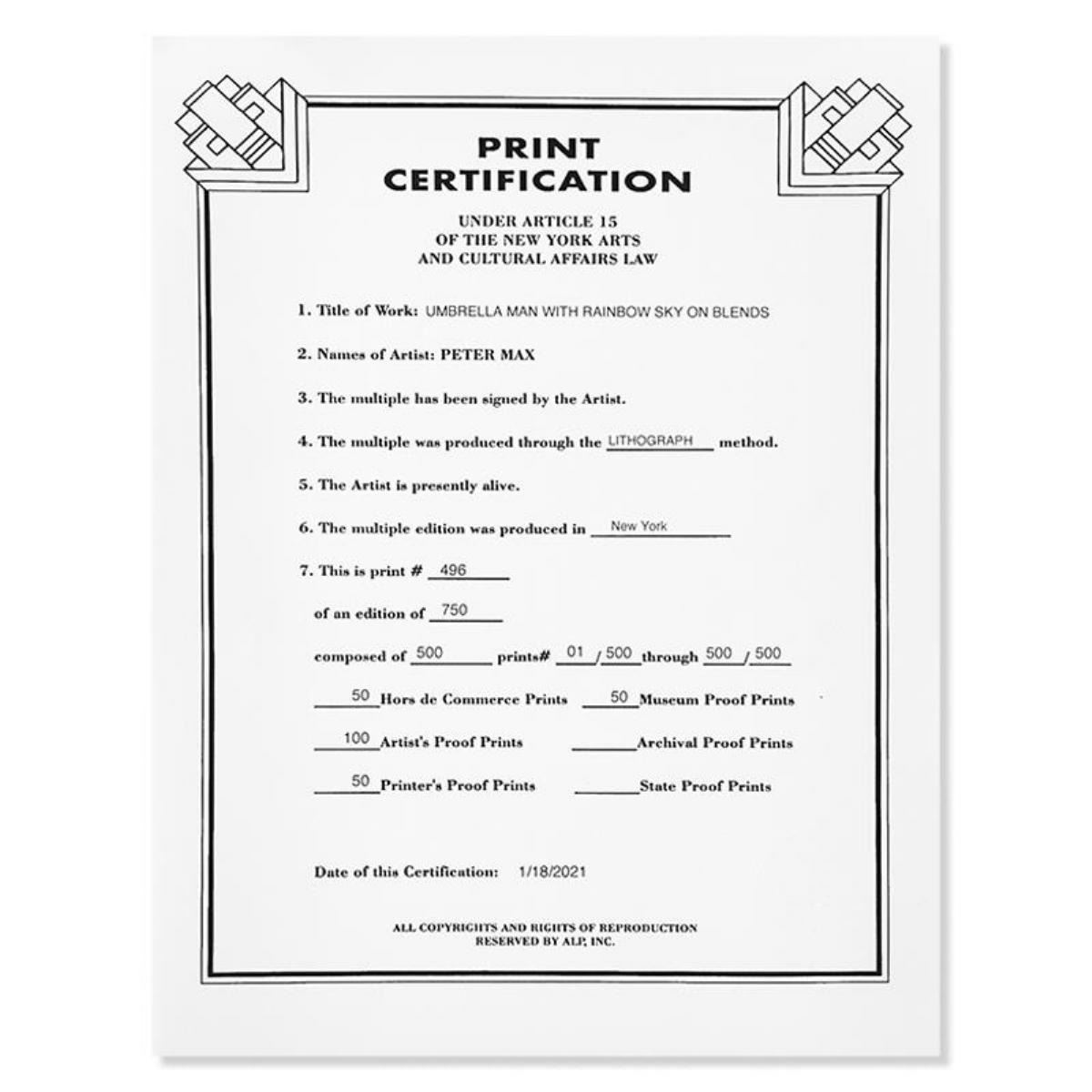 "Umbrella Man with Rainbow Sky on Blends" is a limited edition lithograph on paper by Peter Max, numbered 496/500 and hand signed by the artist. This piece comes framed and includes Certificate of Authenticity from Peter Max Studios. Measures approximately 25.5" x 22.5 (frame), 13" x 10" (image).