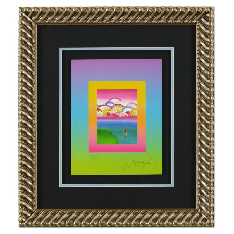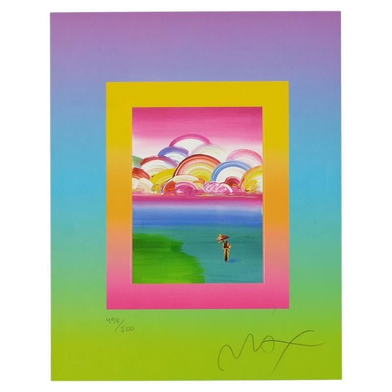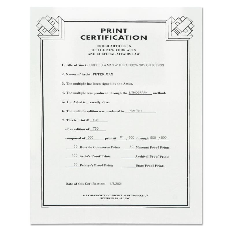 "Umbrella Man with Rainbow Sky on Blends" is a limited edition lithograph on paper by Peter Max, numbered 498/500 and hand signed by the artist. This piece comes framed. Includes Certificate of Authenticity from Peter Max Studios. Measures approximately 21.5" x 24" (frame), 10" x 13" (image).
