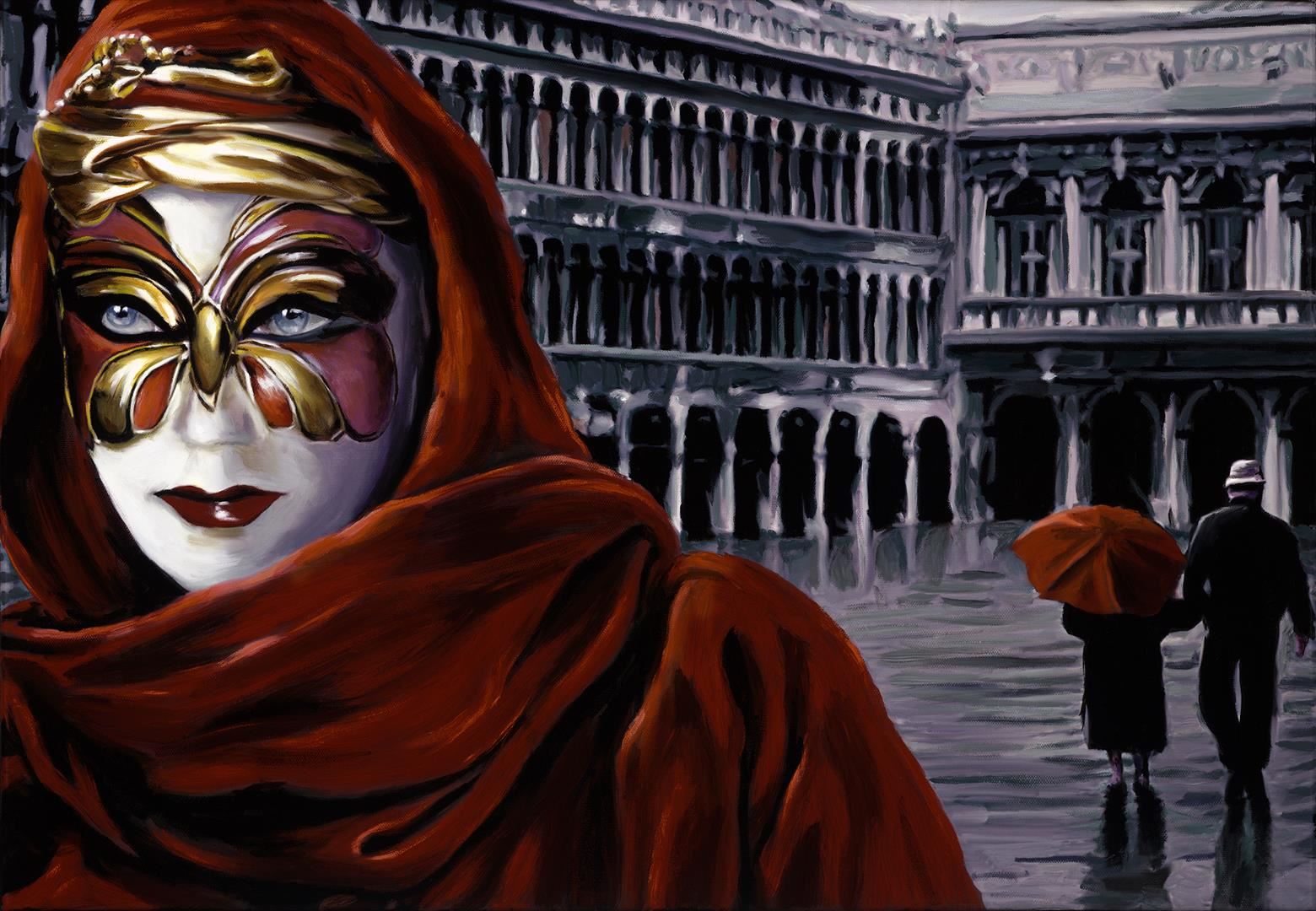 Umbrella by Dellorco. 20"x30" Only in Venice would the mask and the "Umbrella" both be worn at the same time. A Ltd.Edition on canvas. Sn by the artist. Edition 195