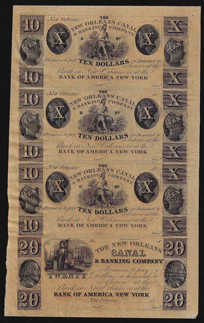 One Uncut Sheet of $10 New Orleans Canal & Banking Company Obsolete Notes.