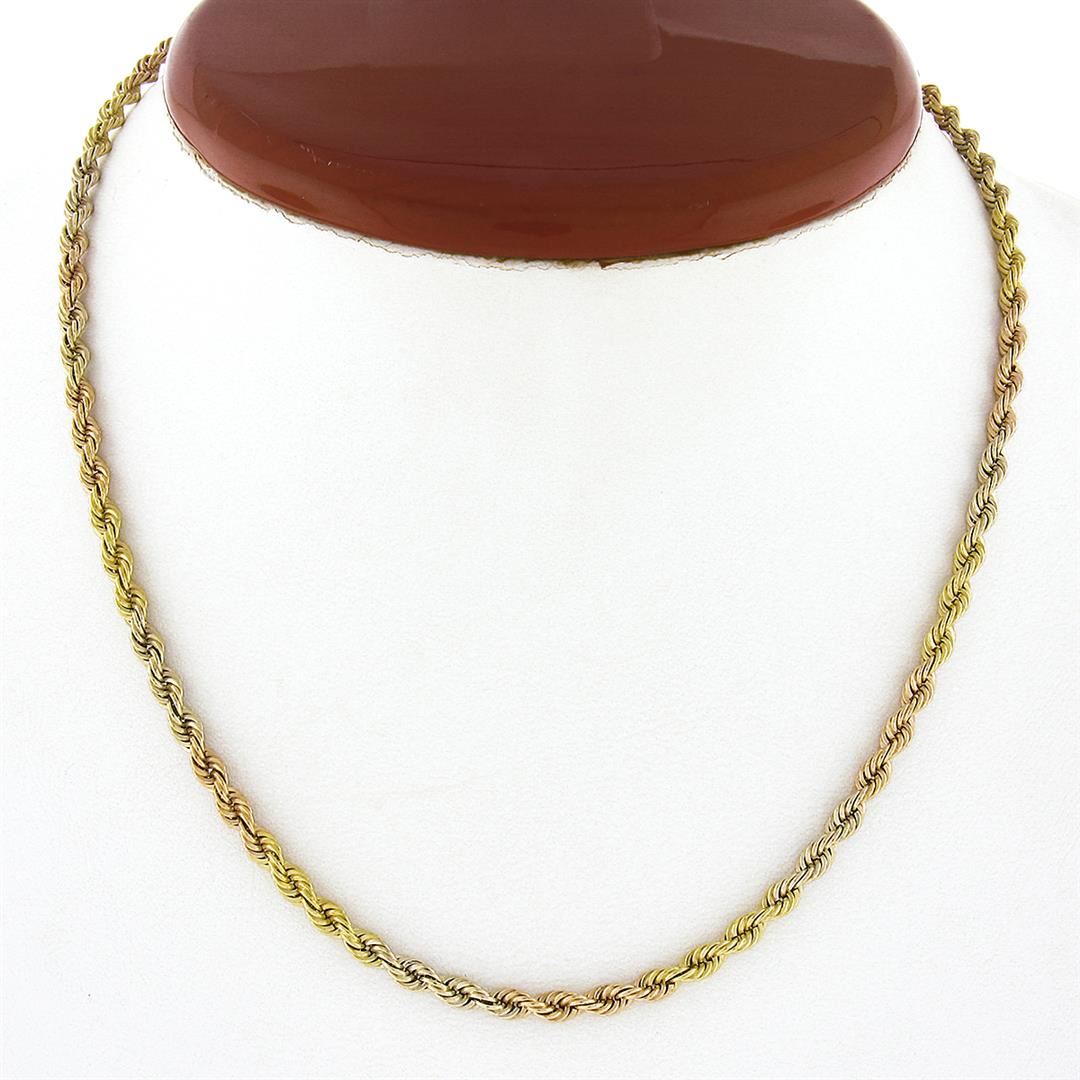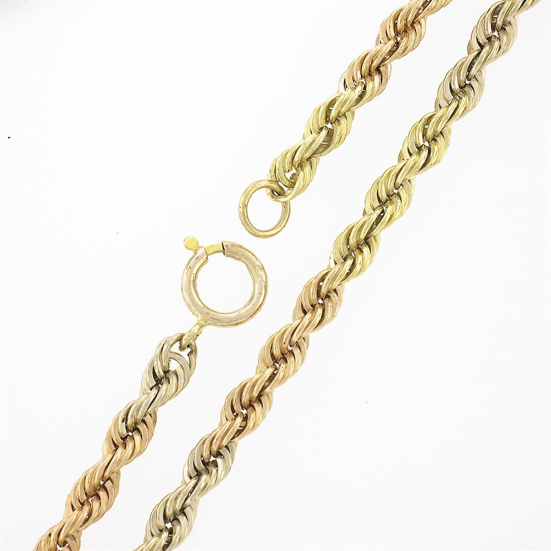 A solid 14k yellow, rose & White Gold rope link chain necklace. It weighs a total of 12.88 grams, measures 3.2mm wide, and measures 15.5 inches in length.