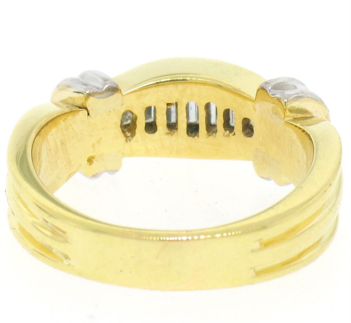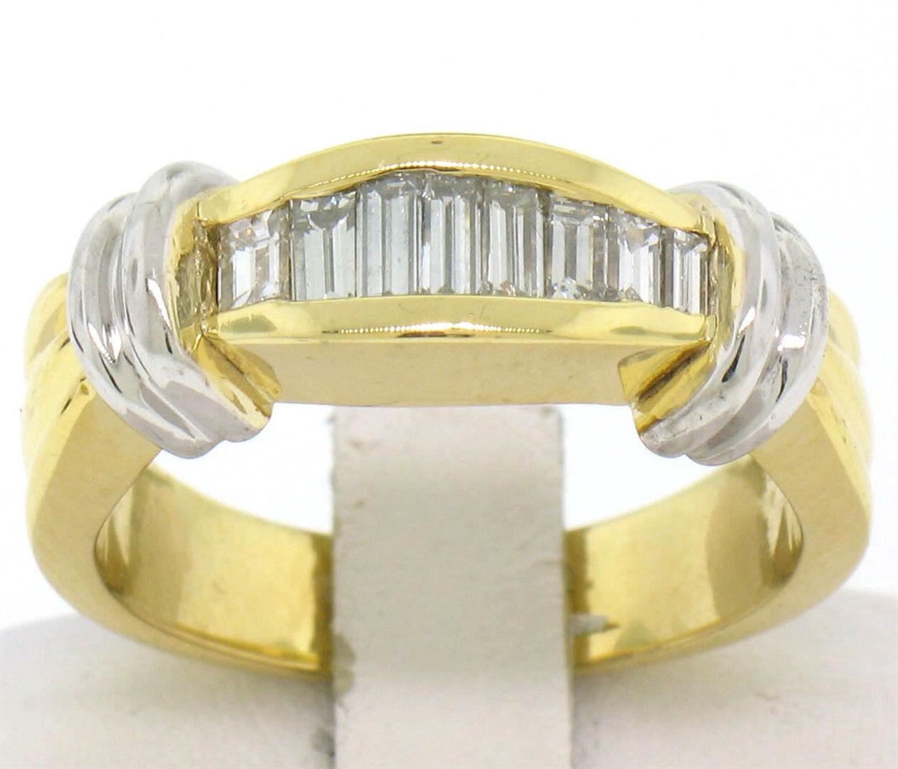 Unique 14k Yellow & White Gold 0.56ctw Graduated Baguette Cut Diamond Band Ring. Please see photos and description for all available information. An estate solid 14k yellow and white gold unique band ring, featuring 8 baguette cut natural diamonds (G/H - VS1/VS2; 0.56ctw). The ring is size 8.0, weighs a total of 9.3 grams, and measures 18.76mm wide.