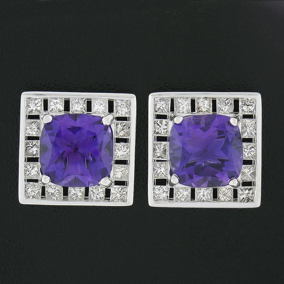 A solid 18k white gold stud earrings, with 2 cushion cut natural amethysts (8.15x8.15mm each - 3.60ctw), and 32 princess cut natural diamonds (H/I - VS2-SI1 ; 1.0ctw). The earrings measure approximately 12.90x12.65mm and weigh a total of 5.30 grams.